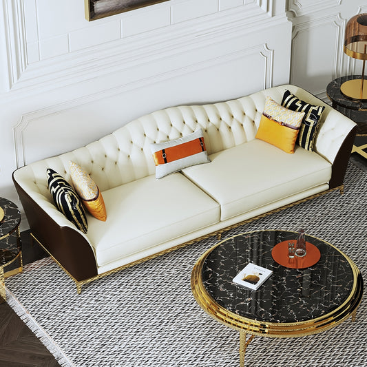 72.8" Faux Leather Upholstered Sofa White and Brown Mid-Century Couch Curved Tufted Back