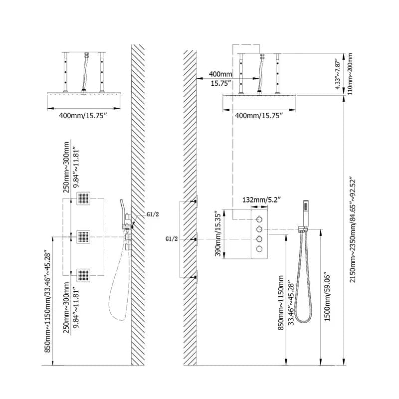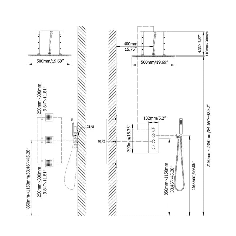 Shower Head Diameter/Width: 15.75"/400mm 19.69"/500mm