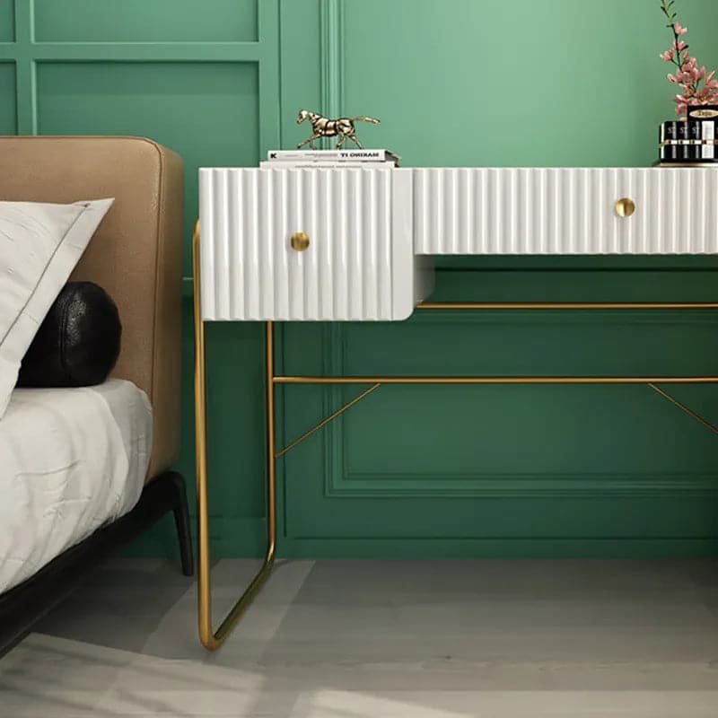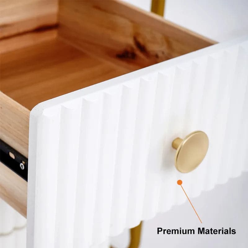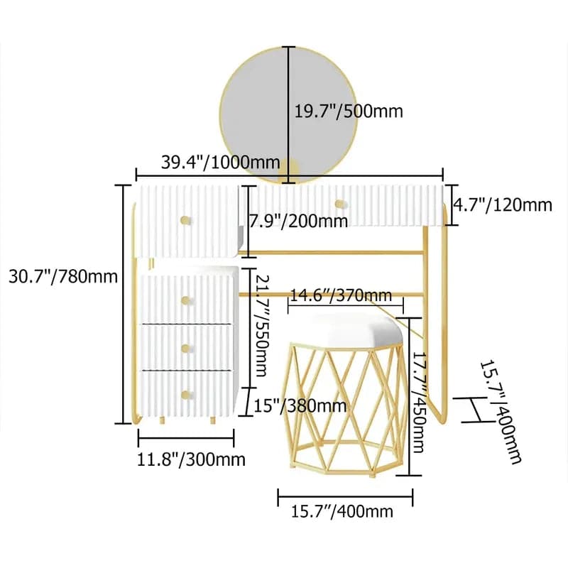 Featuring wave-like veins with a white tone and gold finish, the makeup vanity set combines fashion and elegance to match any style of any room. Featuring the design of a flexible cabinet, it can be used as a dressing cabinet or a nightstand. 2-drawer dressing table offers ample storage for your various cosmetics, jewelry, perfumes, etc. It is crafted from premium solid wood, HDF, and steel to ensure beauty and durable usage for years to come.