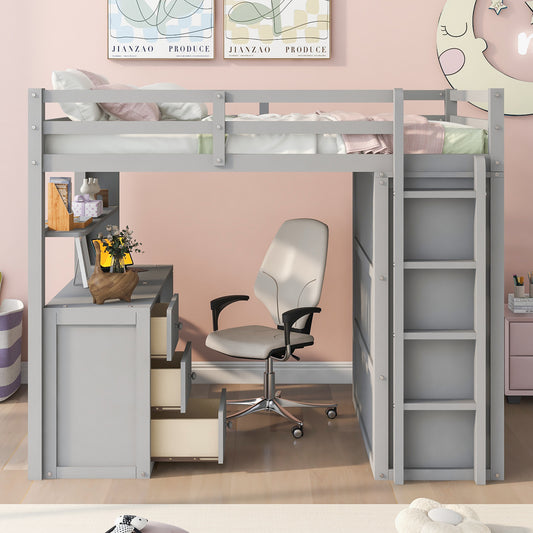 Full size Loft Bed with Drawers,Desk,and Wardrobe-Gray