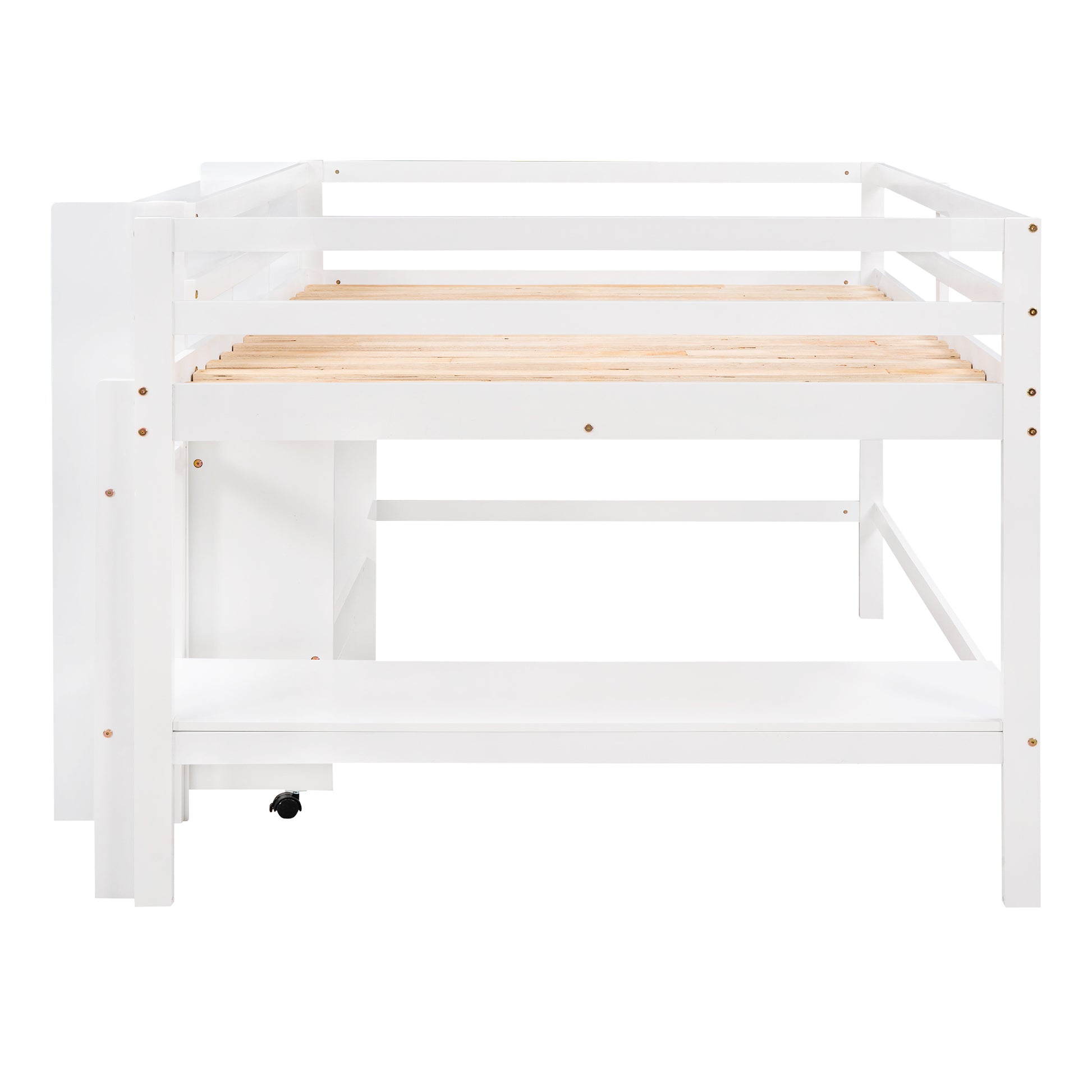 Full Size Low Loft Bed with Rolling Portable Desk, Drawers and Shelves, White