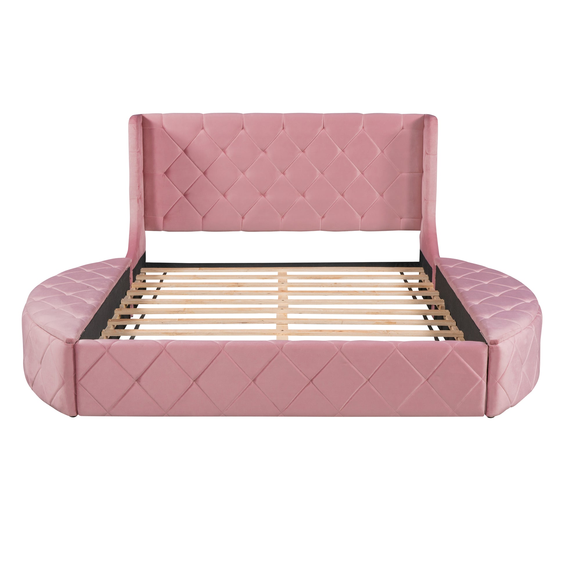 Upholstered Platform Bed Queen Size Storage Velvet Bed with Wingback Headboard and 1 Big Drawer,2 Side Storage Stool(Pink)