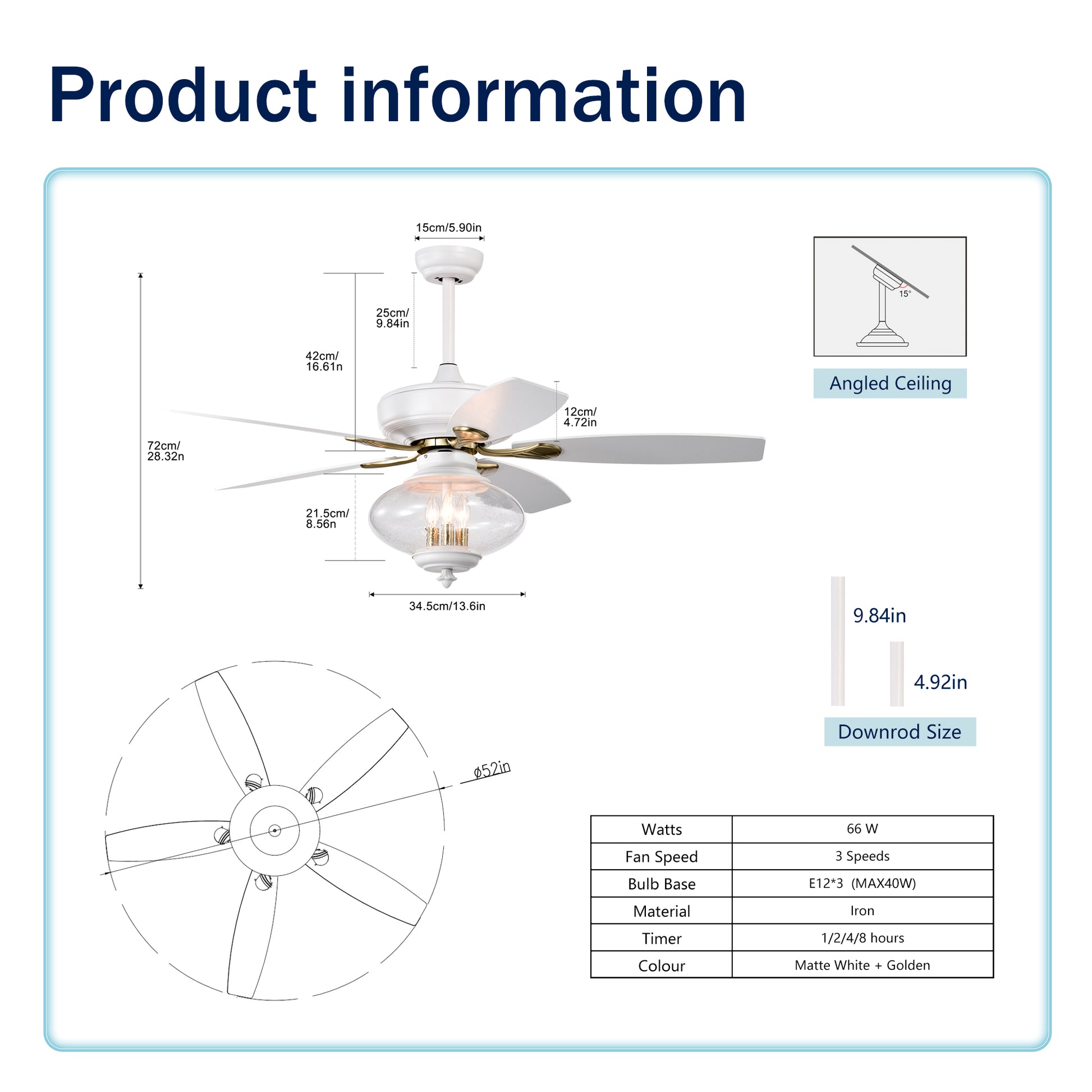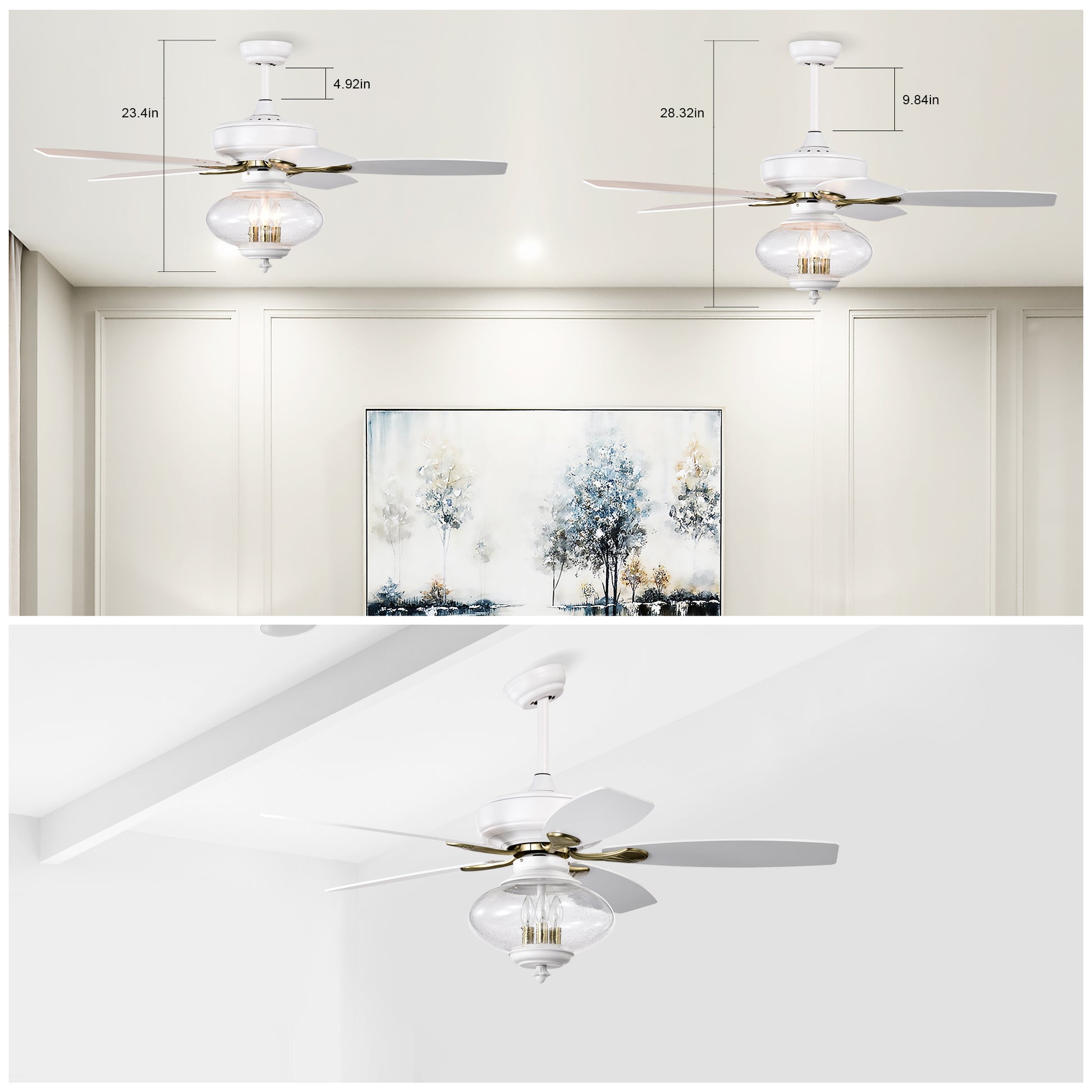 - 【TWO MOUNT COMPATIBLE 】: This fan can be hung with the standard mount,AND angled ceilings (max angle: 15°), down rods included (4.98/9.8″).