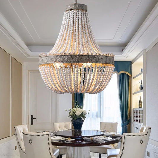 3-Light White Wood Beads Pendant Light Rustic Wrought Iron