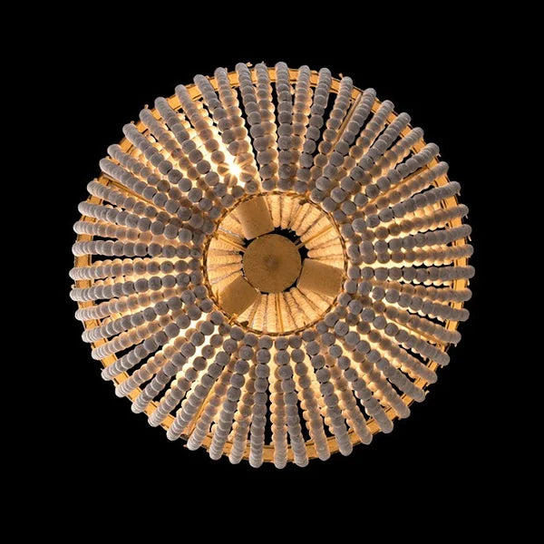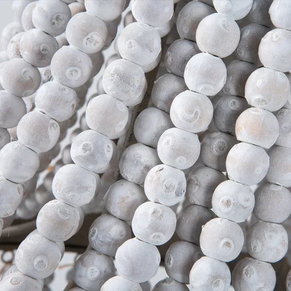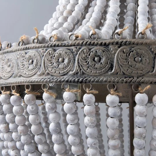 Refashion your living space with this rustic wood bead pendant light. Featuring a fall of white washed wood beads draped down from the metal bands, this graceful pendant light emits a breath of dignity and elegance all the time. Two metal bands engraved with blooming flowers in antique brown boast refined craftsmanship and add to the elegant and romantic appeal, while a robust iron structure holds three warm light bulbs in an endearing manner. Perfect for hanging above the foyers, living rooms, dining rooms, bedrooms, and more.