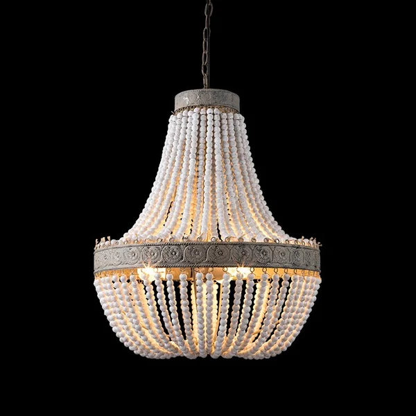 3-Light White Wood Beads Pendant Light Rustic Wrought Iron