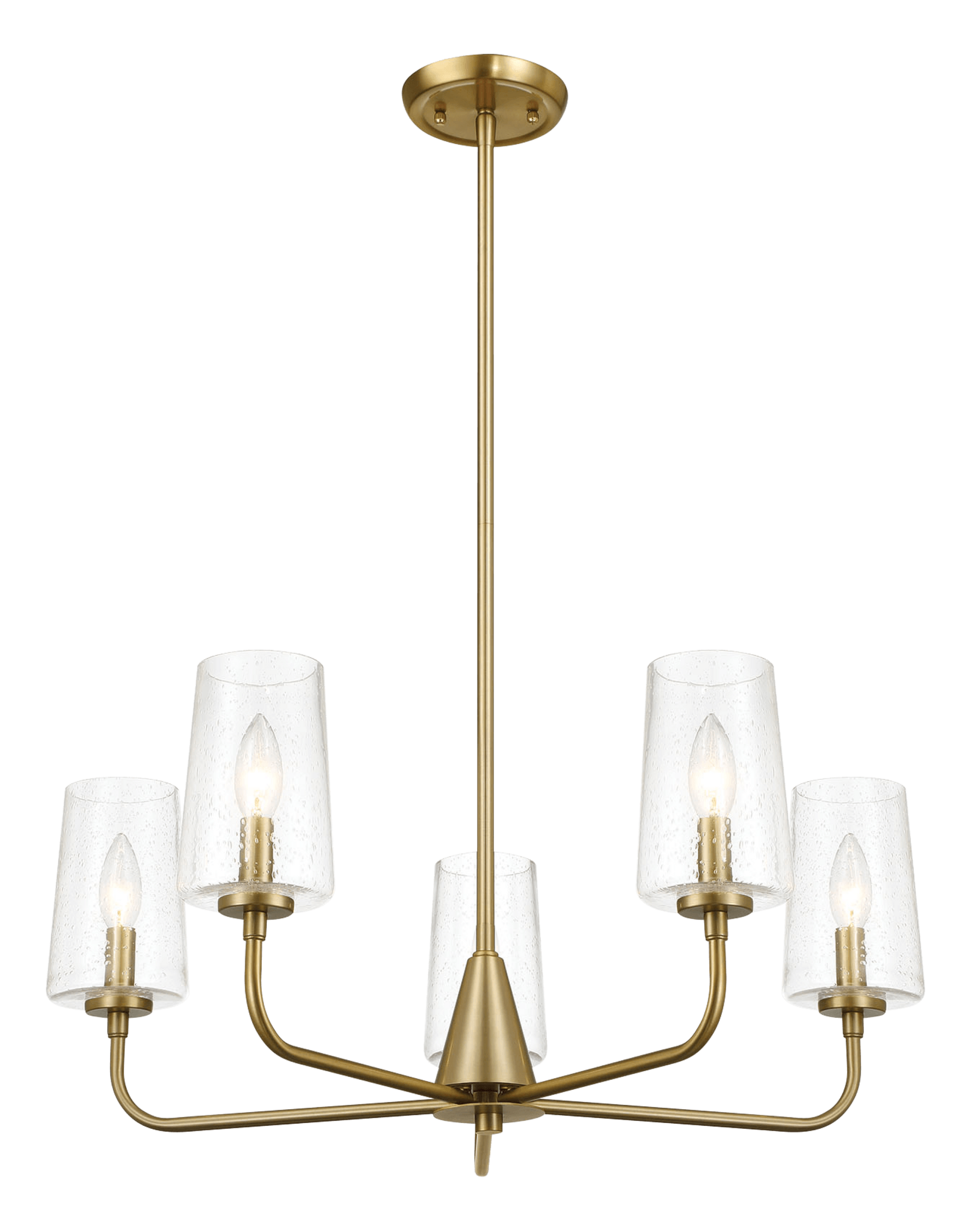 - With its clear seeded glass and satin brass finish, this chandelier exudes an air of elegance and sophistication. The five lights offer plenty of illumination for any event or occasion, making it both a practical and stylish choice for your home.