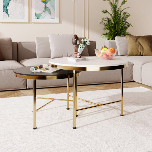 Modern Round Nesting Coffee Table Set 2-Piece White & Marbling Top Gold Base