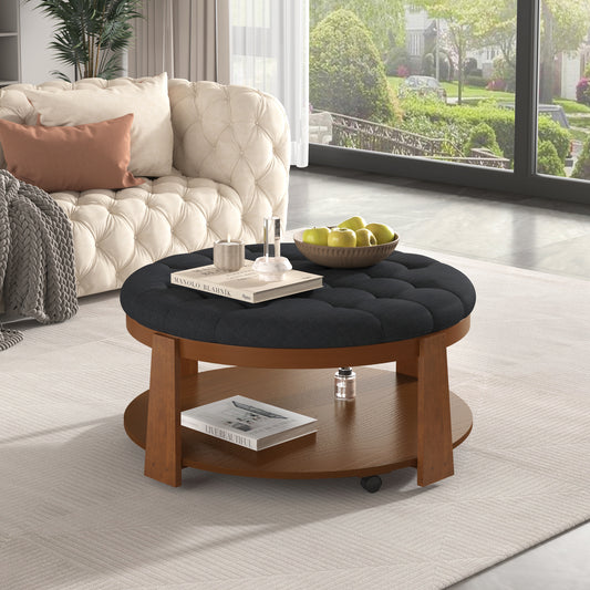 Modern Large Round Ottoman Coffee Table 2-Tier Oversized Button Tufted Ottoman with Wood Shelf Storage Upholstered Coffee Table for Living Room Footrest Ottoman with wheel, waterproof Linen