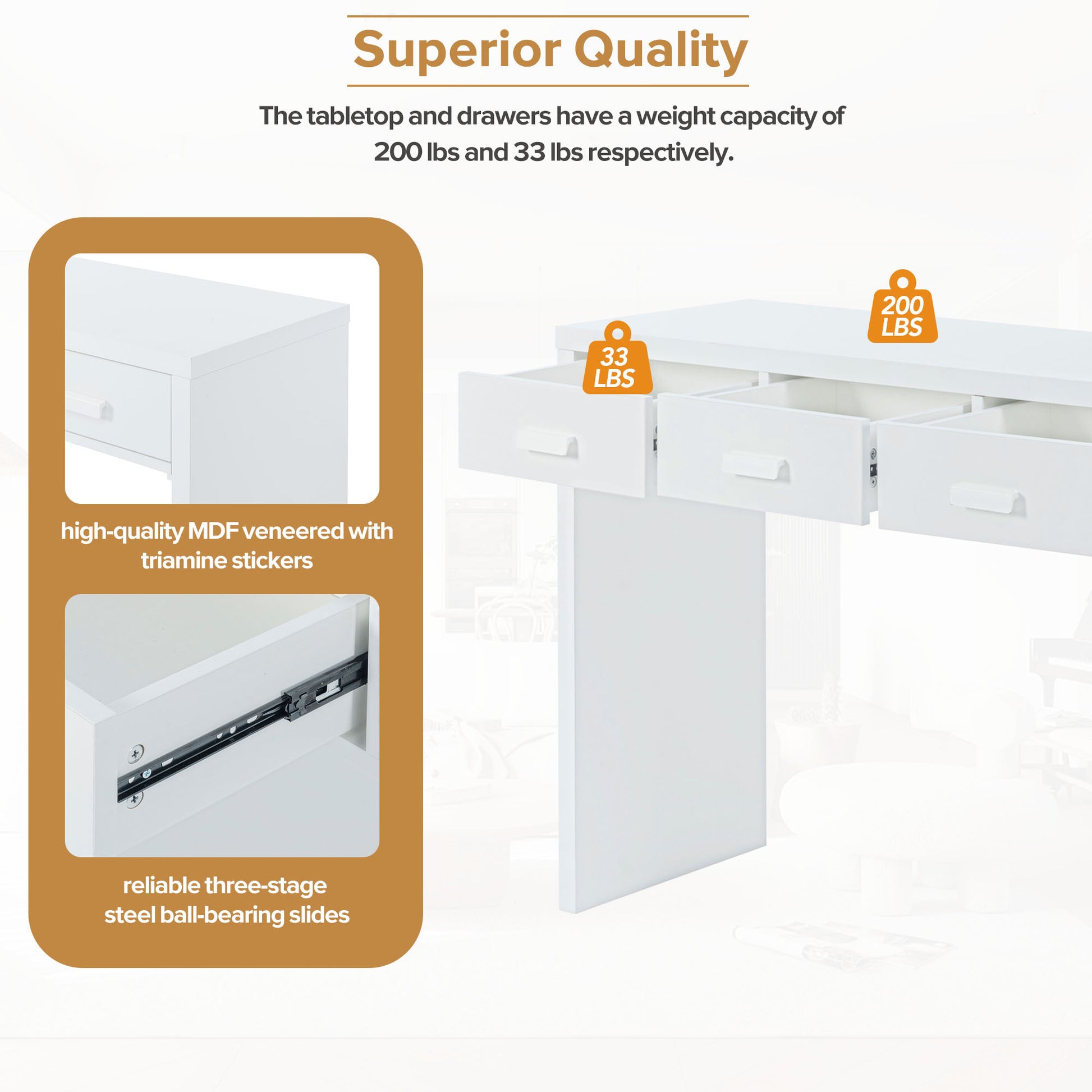 • Superior Quality: The console table is made of high-quality MDF veneered with triamine stickers, which undoubtedly ensures stability and durability. The drawer handles are made of aluminum alloy with painting on the surface, adding texture to the overall product. It is worth mentioning that the drawer uses a reliable three-stage steel ball-bearing slide, greatly increasing its smoothness and usability. The tabletop and drawers have a weight capacity of 200 lbs and 33 lbs respectively.