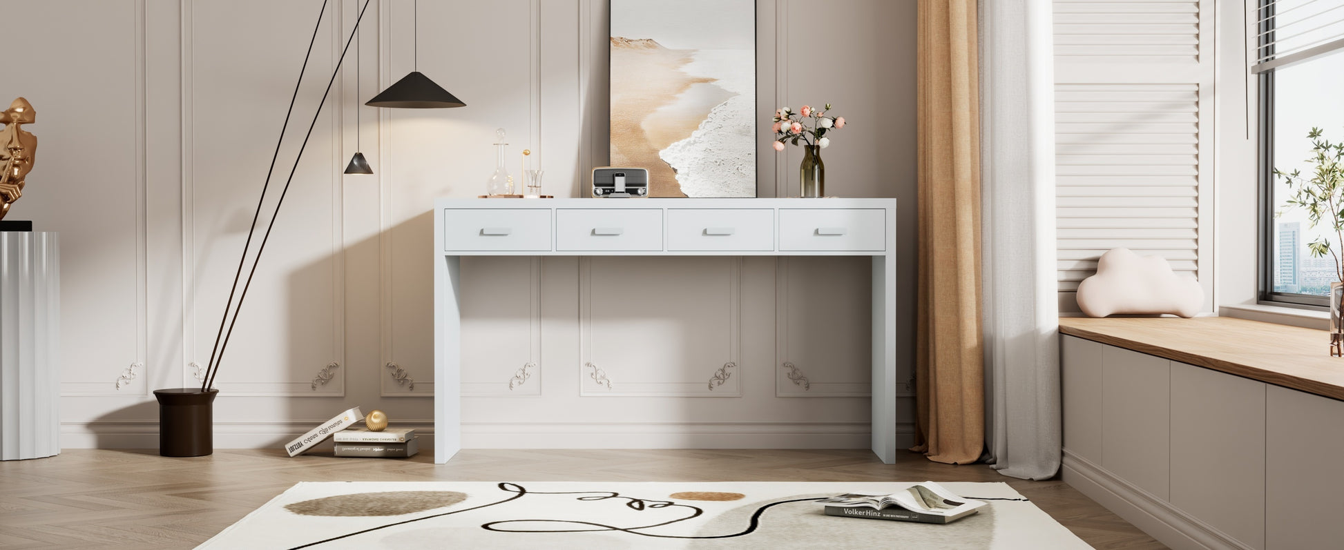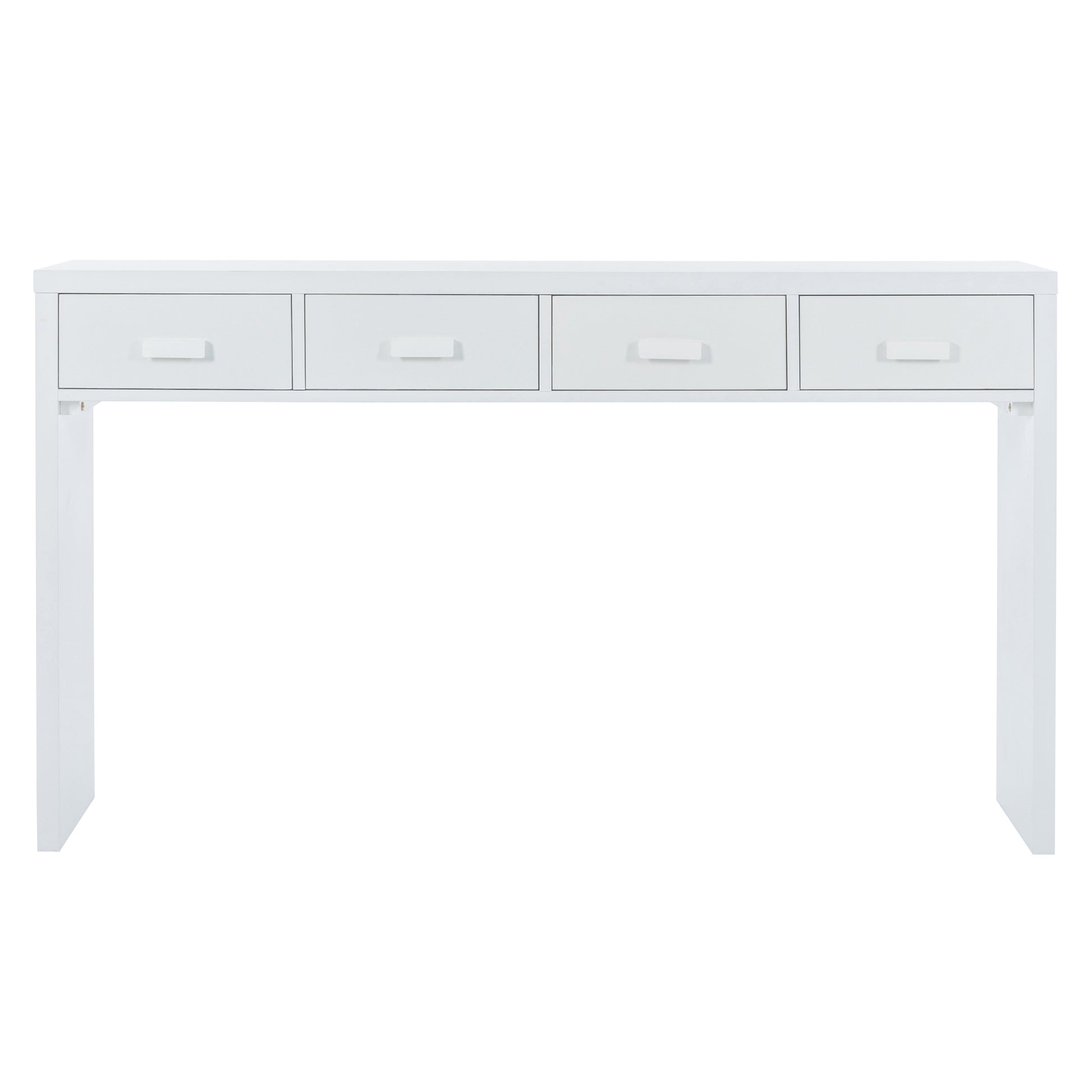 TREXM Modern Minimalist Console Table with Open Tabletop and Four Drawers with Metal Handles for Entry Way, Living Room and Dining Room (White)
