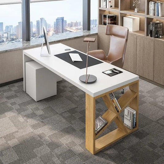 Modern White and Natural Rectangular Writing Desk with Shelves