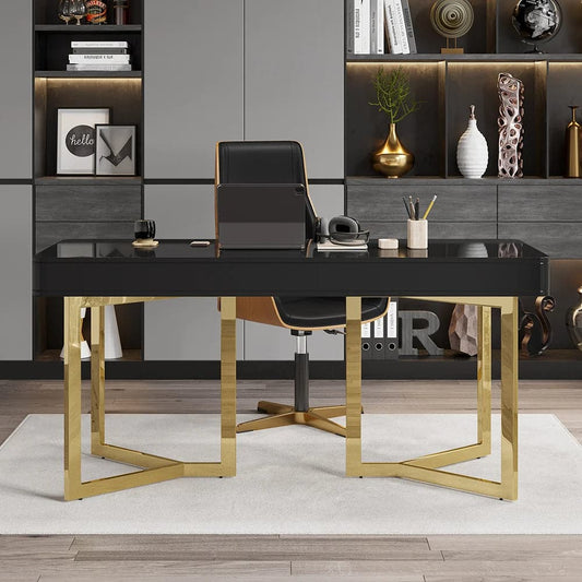 Modern Black/White Computer Desk Rectangular Desk with Solid Wood Table Top & Gold Frame