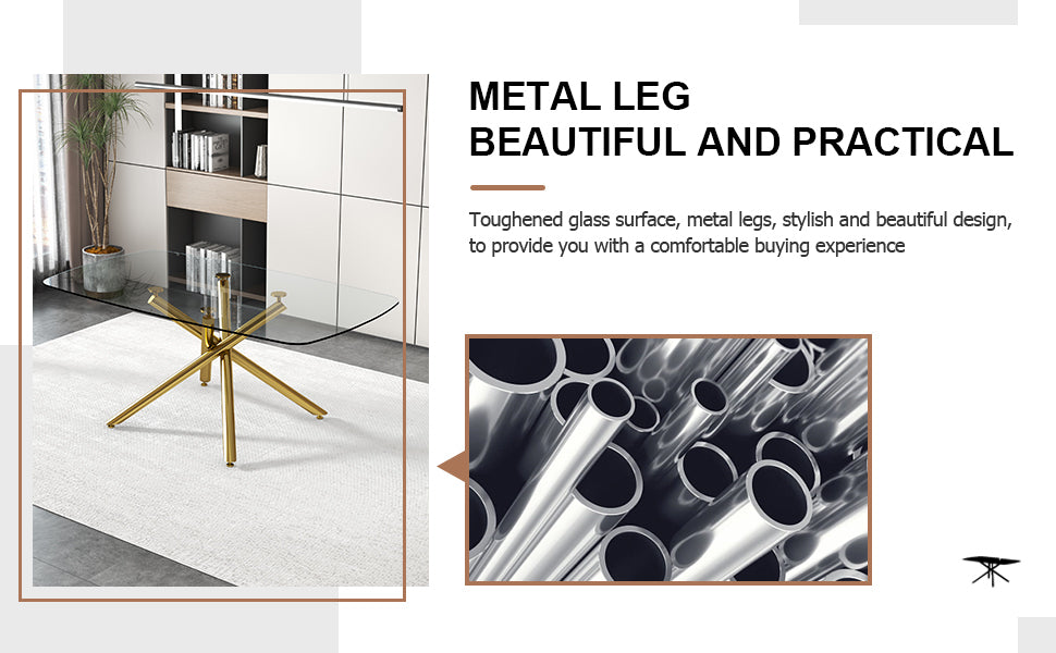Large Modern Minimalist Rectangular Glass Dining Table with 0.39" Tempered Glass Top and Gilded Metal Legs for Kitchen, Dining Room, Living Room, Meeting Room, Ballroom 71" x 35.4" x 30".