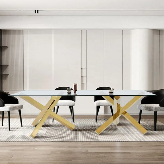 95" Modern Glass Dining Table with Double Pedestal in Gold