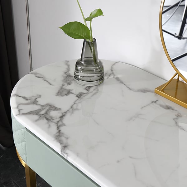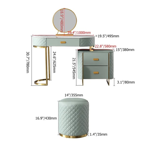 Accented with a clean-lined silhouette with faux leather upholstery, this makeup vanity lends a glamorous flair that blends well with any modern decor. Featuring the side cabinet, the vanity table offers ample storage rooms for your articles of daily use. Boasting refined manufactured wood with high-class stainless steel, it allows long-lasting service and timeless sophistication.
