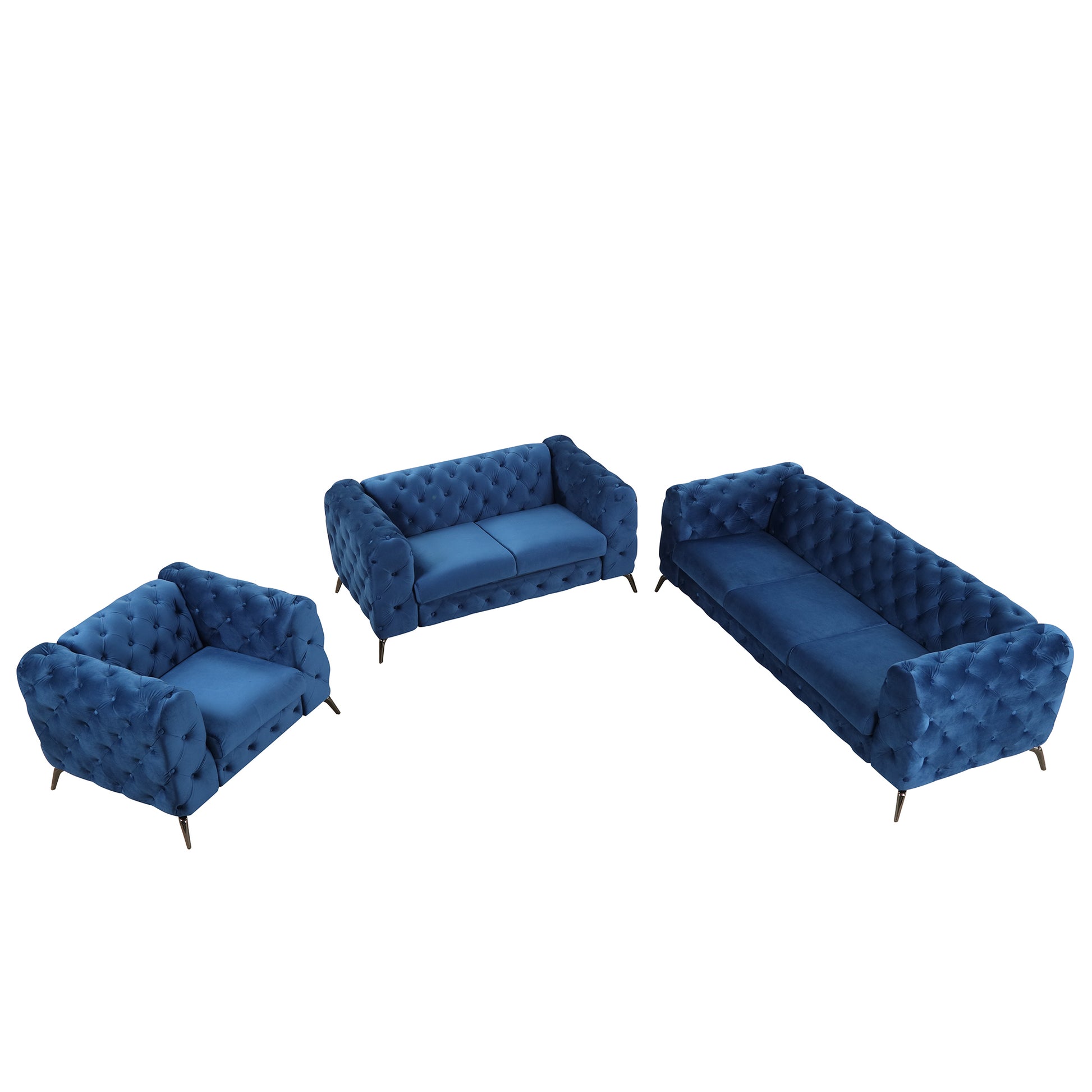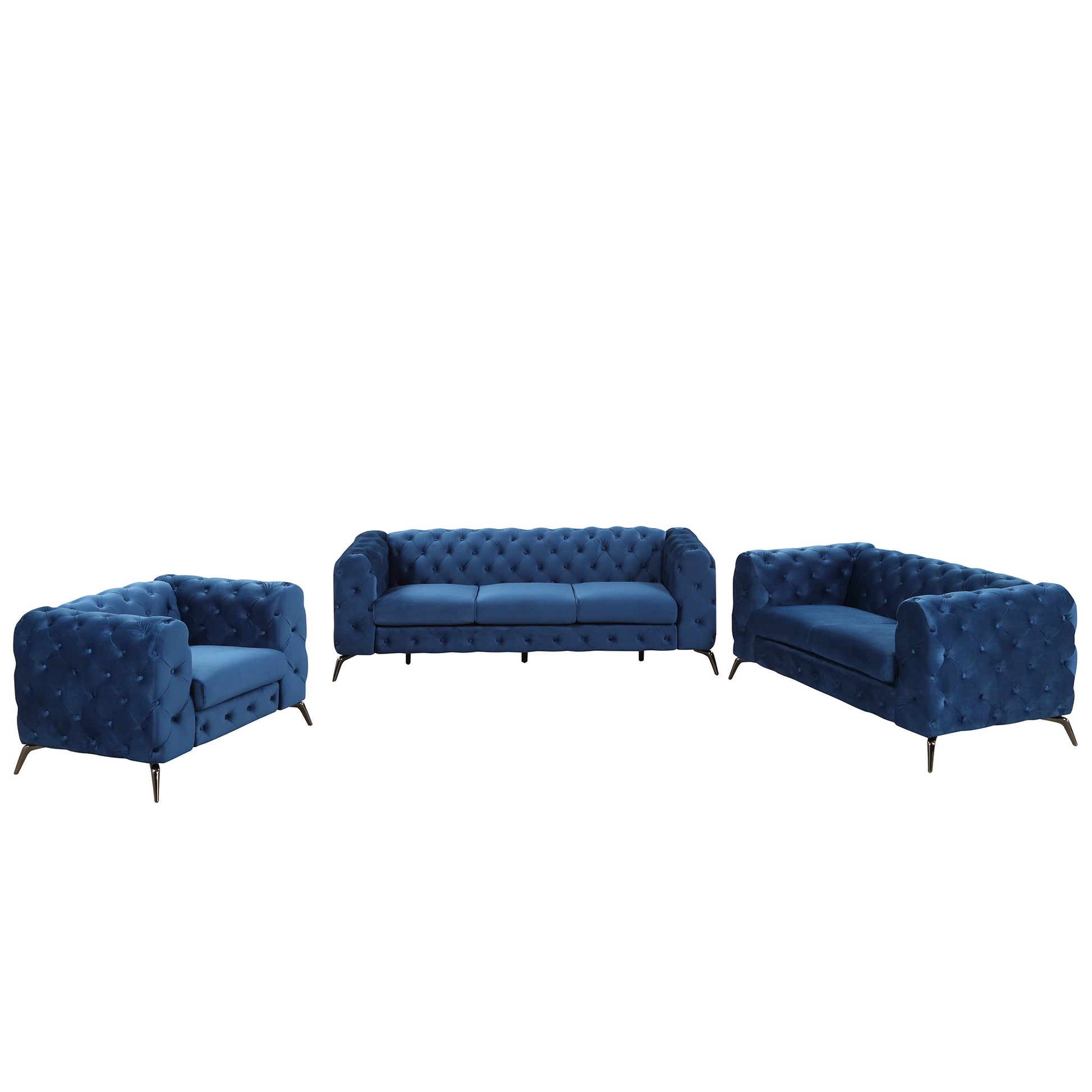 Modern 3-Piece Sofa Sets with Sturdy Metal Legs,Velvet Upholstered Couches Sets Including Three Seat Sofa, Loveseat and Single Chair for Living Room Furniture Set,Blue