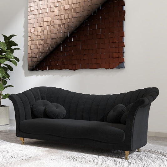 86.6" Black Velvet Upholstered Sofa Channel Tufted 3-Seater Sofa in Gold