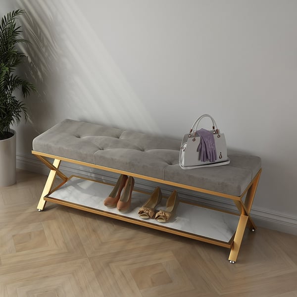 This exquisite bench oozes glitz and refinement. Its sleek metal frame contains a shiny bottom shelf for shoes and supports one soft cushioned cushion for sitting comfortably and tastefully while changing shoes; because of that, this exquisite bench could add dramatic elegance to your space. The modest velvet upholstery with foam cushioning gives it a hint of modern flair and comfort to the touch. This shoe bench not only saves room but also makes your house neater. You may also take a rest when you are fatigued or a fantastic adornment to make your house lovely and elegant. There is magnificent cabinetmaking work with its rounded edges, and carefully cross-shaped angles might be employed inside or outside the bedroom, workplace, rest space, or at the corridor's doorway.