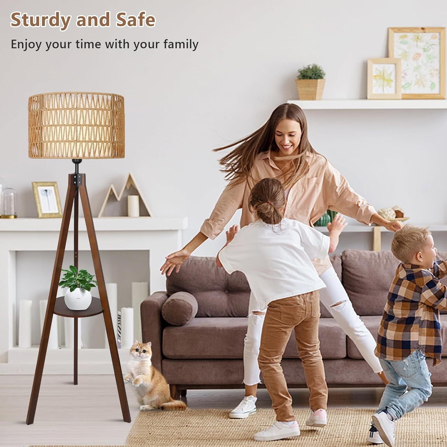 - ?【Floor Lamp With Shelves】The shelf of this tripod lamps for living room is made of high-quality Nature Rubber wood and can be used to store and display objects. You can put plants, photo frames, books or any small things you want on it. This mid century floor lamp is both practical and fashionable, and is the highlight of your home decoration. Perfect for living room, bedroom, rec rooms, study, office and corner sofa.