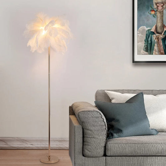 Floor Lamp with White Feather Shade Rose Gold Finish