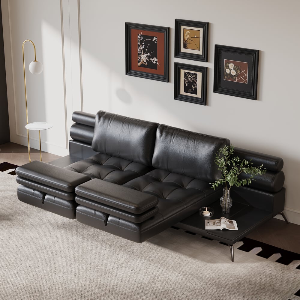 This 102" faux leather convertible sofa offers versatile comfort with adjustable armrests and a sleeper function. Its solid wood frame transforms into a side table, combining style, practicality, and space-saving design for modern homes.