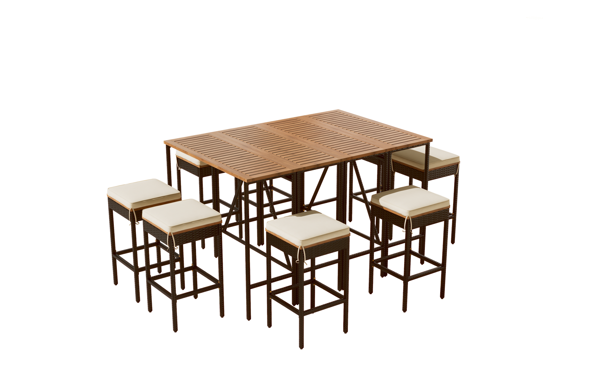 GO 10-Piece Outdoor Acacia Wood Bar Height Table And Eight Stools With Cushions, Garden PE Rattan Wicker Dining Table, Foldable Tabletop, High-Dining Bistro Set, All-Weather Patio Furniture, Brown