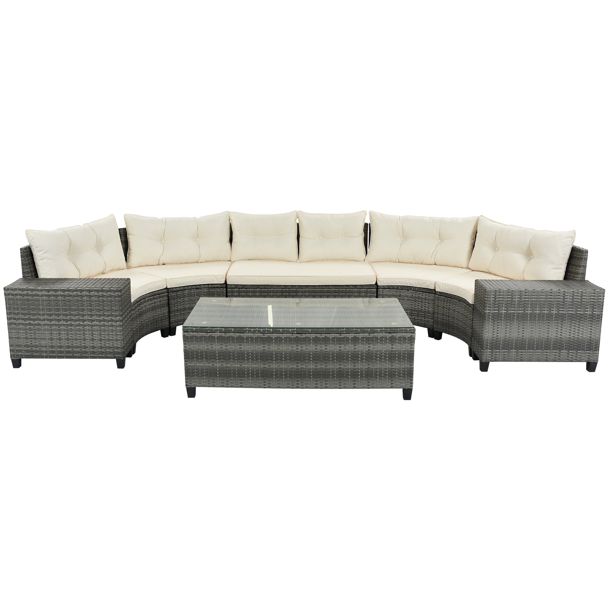GO 8-pieces Outdoor Wicker Round Sofa Set, Half-Moon Sectional Sets All Weather, Curved Sofa Set With Rectangular Coffee Table, PE Rattan Water-resistant and UV Protected, Movable Cushion, Beige