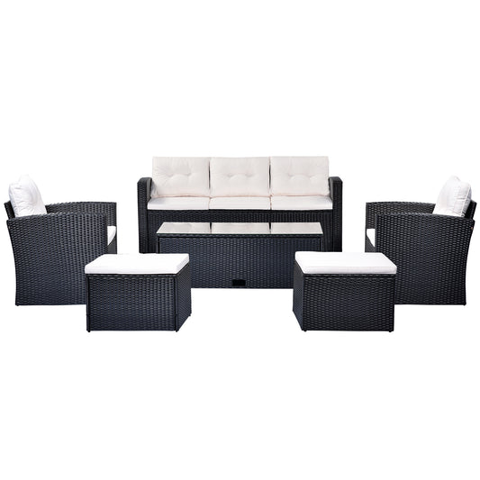 GO 6-piece All-Weather Wicker PE rattan Patio Outdoor Dining Conversation Sectional Set with coffee table, wicker sofas, ottomans, removable cushions (Black wicker, Beige cushion)