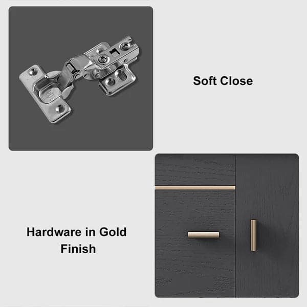 - Includes a large solid wood center cabinet with 2 soft-close hardware doors.