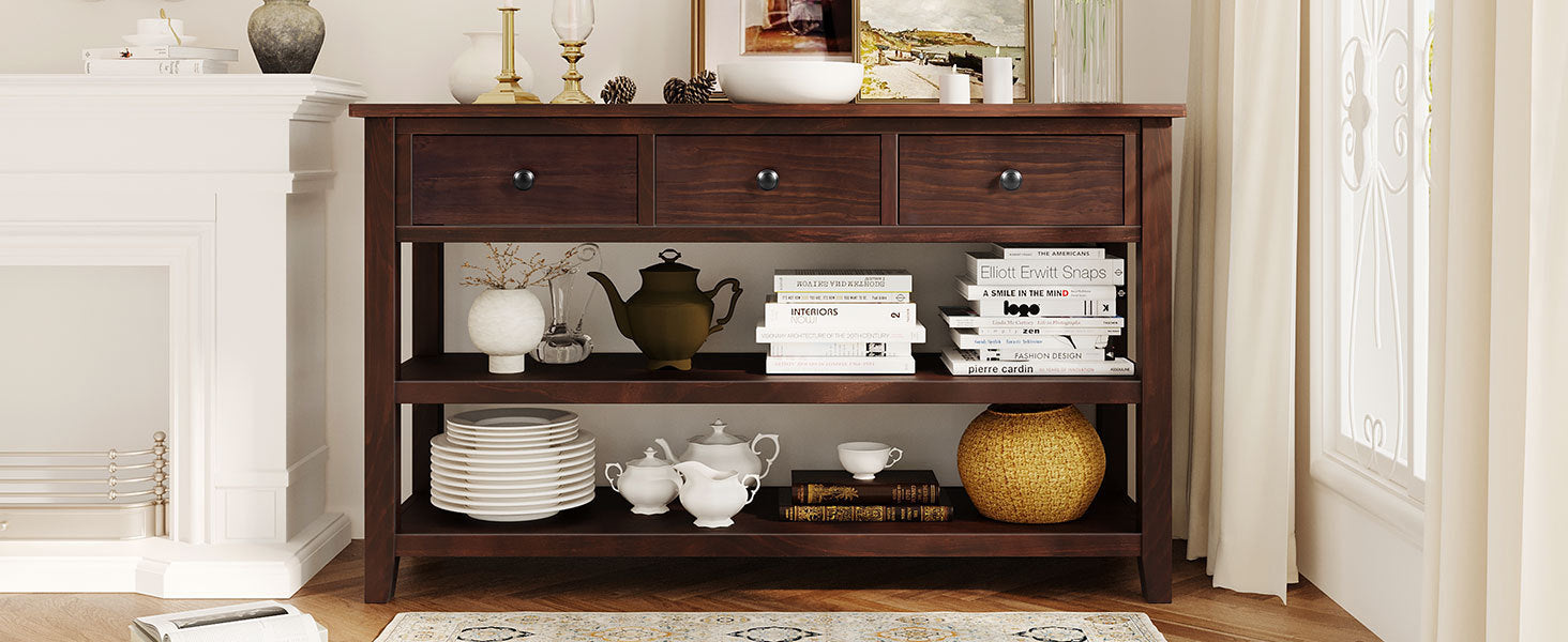There are 3 drawers set under the tabletop to offer large room for storing daily necessities or files, and so on. You can keep daily sundries out of your sight to ensure your home clean and tidy. Round retro handles with fine craftsmanship shows a delicate and elegant life attitude. As a practical console table, the open style shelf is a vital element. The setting of 2 open shelves meet the requirements of placing storage basket, books, pot culture, etc.