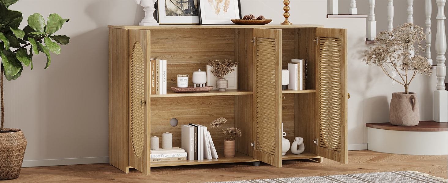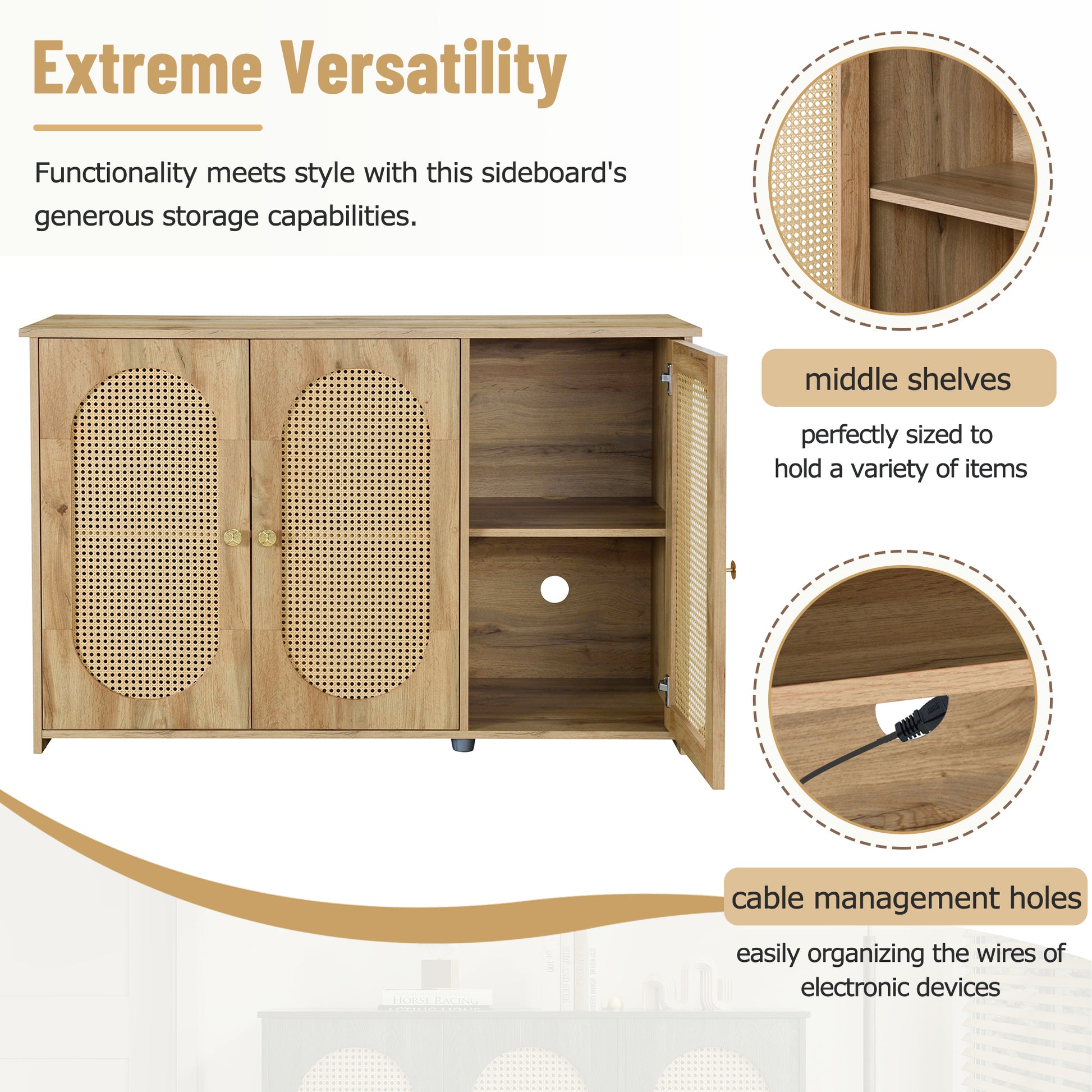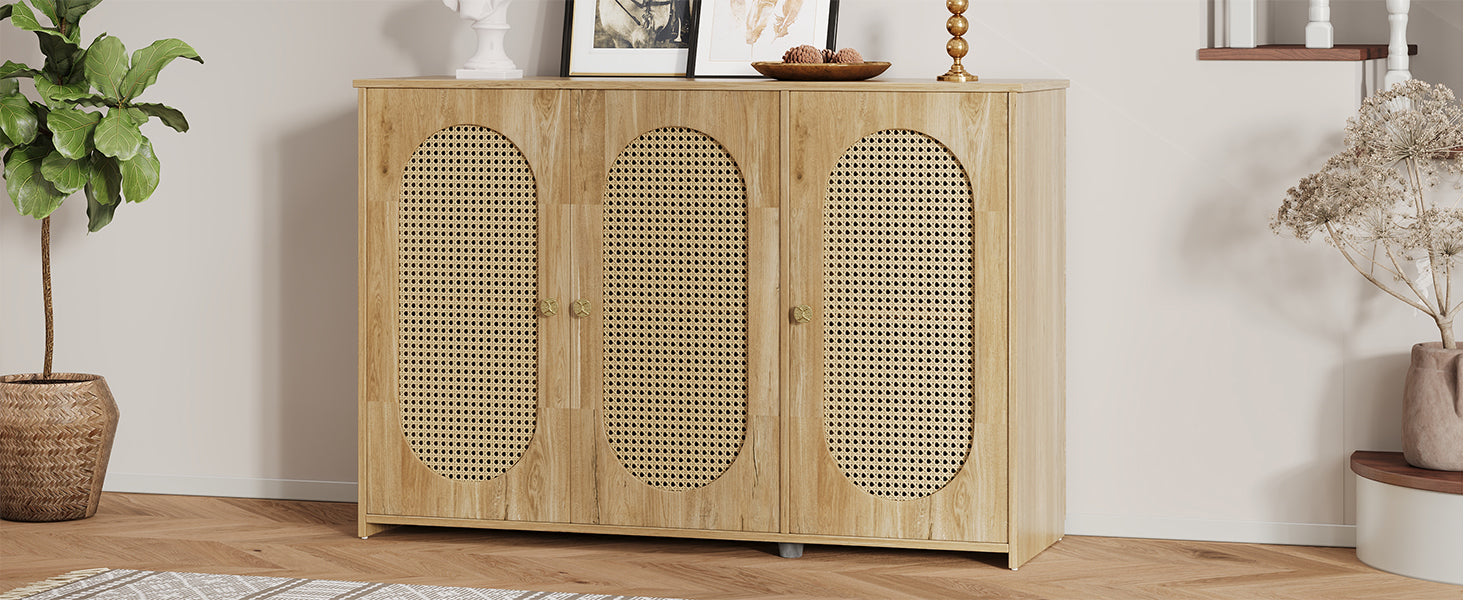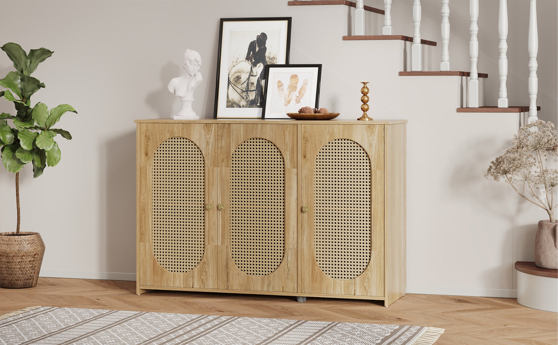 - Notable Details: This sideboard captures the essence of retro elegance with its meticulously crafted design elements. The stickers on the surface mimic the look and feel of real wood, exuding a timeless sophistication. The oval artificial rattan door panels create a beautiful contrast and add depth to the overall appearance. Moreover, round metal electroplated handles add a touch of vintage flair benefiting from exquisite patterns. All intricate details make it perfect for any retro interior.