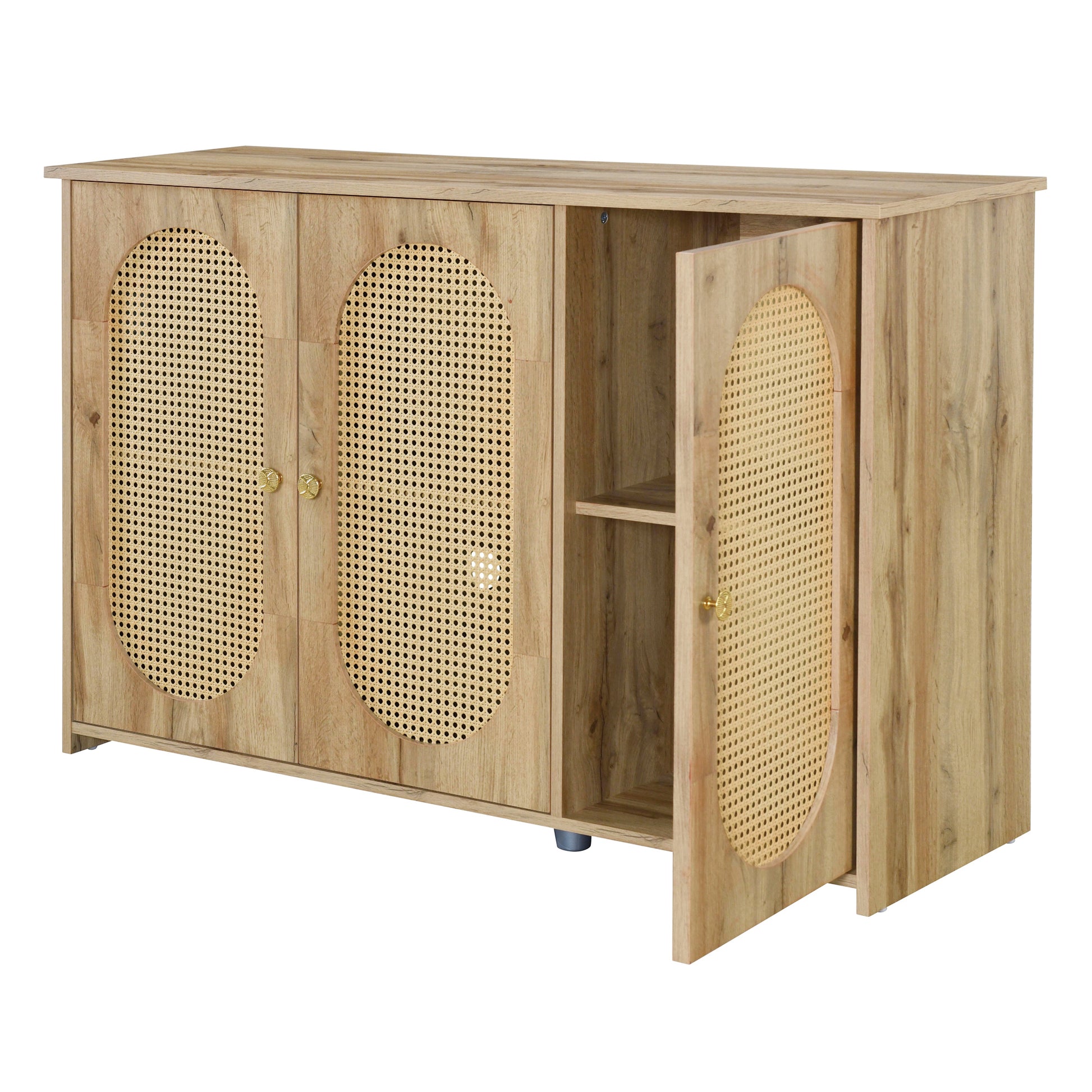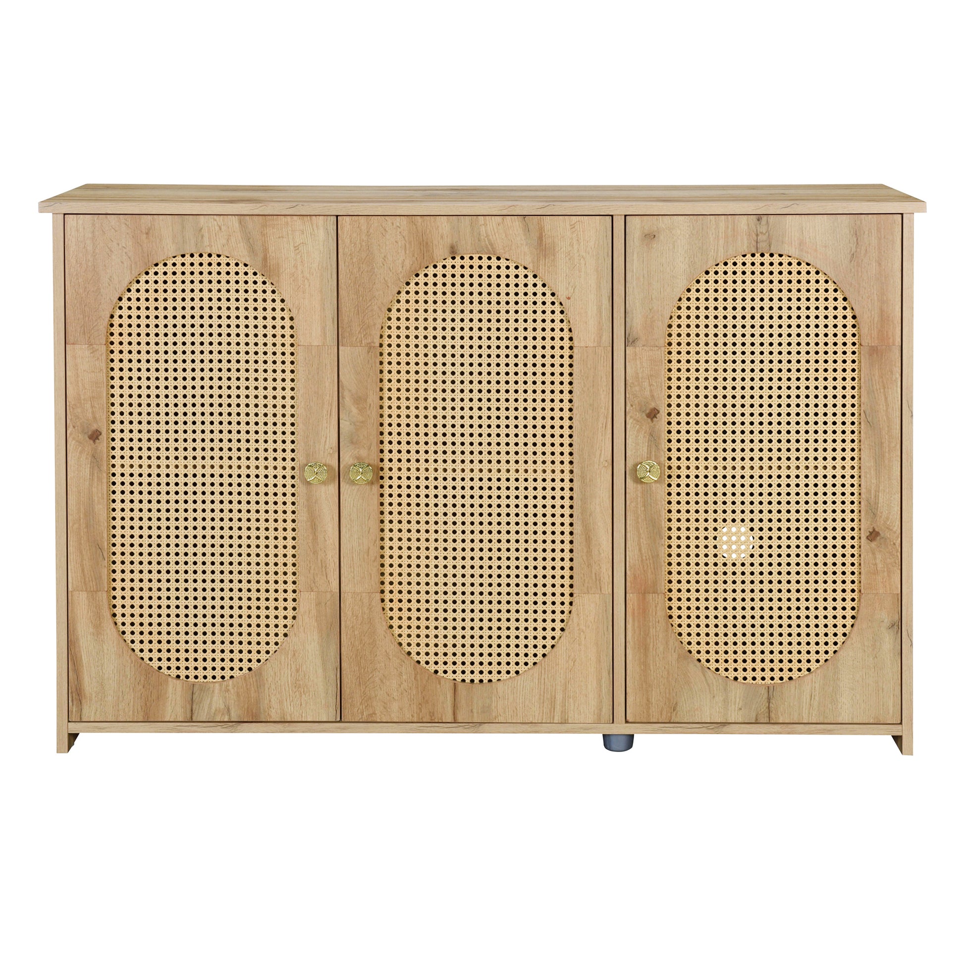 TREXM Retro 3-Door Sideboard with Large Storage Space Artificial Rattan Doors and Metal Handles, Accent Cabinet for Living Room and Hallway (Natural Wood)