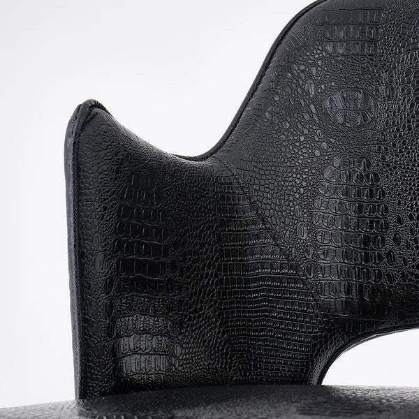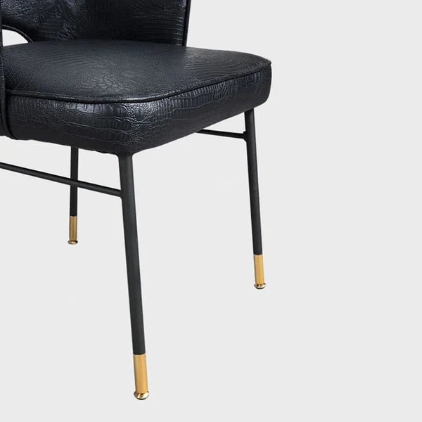 With its mid-century inspired design, this set pulls up the latest trends to any dining or breakfast nook table. The slim, black metal legs support the faux leather upholstery seat with crocodile-skin texture, making it elegant and attractive. While the gold metal feet add a touch of glamorous appeal that finishes the design perfectly. The high back and arms, padded with high-density foam, feature unique curved lines that add a distinctive twist to the piece and offer great comfort as well. The solid wood frame and metal legs provide an exceptional degree of stability to hold up for many years to come. Plus, metal pads prevent the chair from slipping on or damaging flooring. It is an impressive chair that is certain to turn heads.