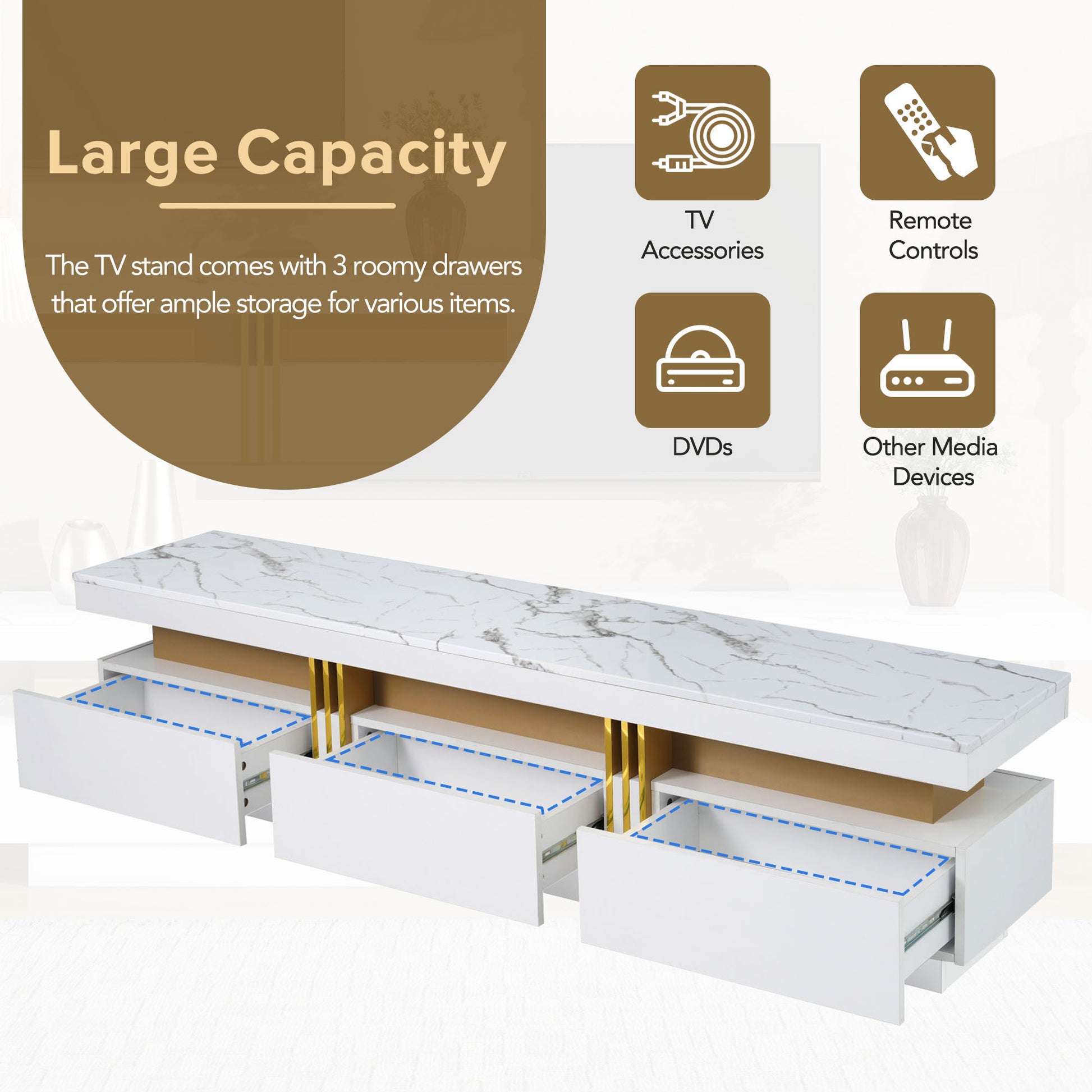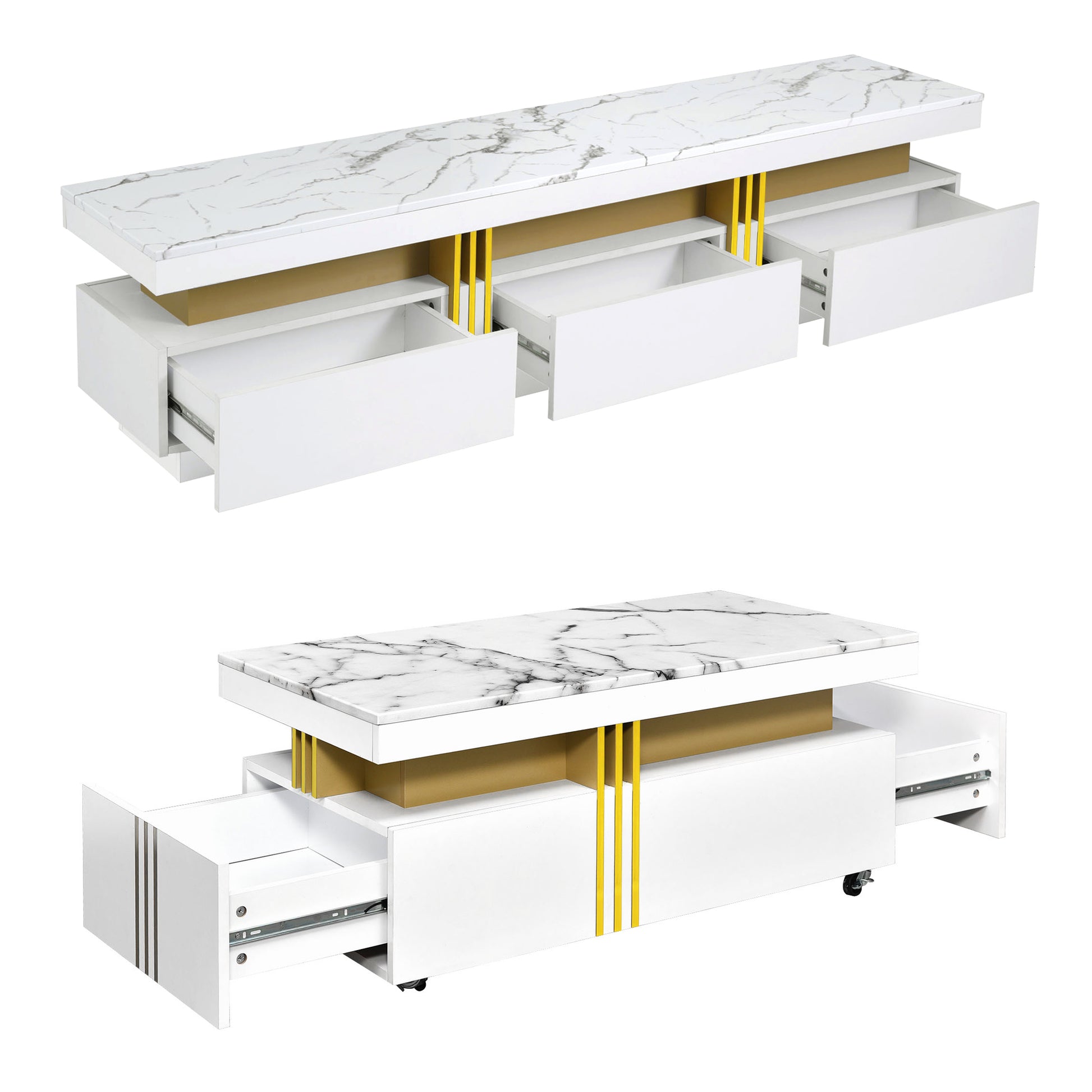 The exquisite faux marble top beautifully complements the golden compartment, adding a luxurious feeling to this TV stand and coffee table set. Whether this 2 products are placed in the living room or bedroom, it can become the focal point of the space, showing a sense of high-end and refined home.