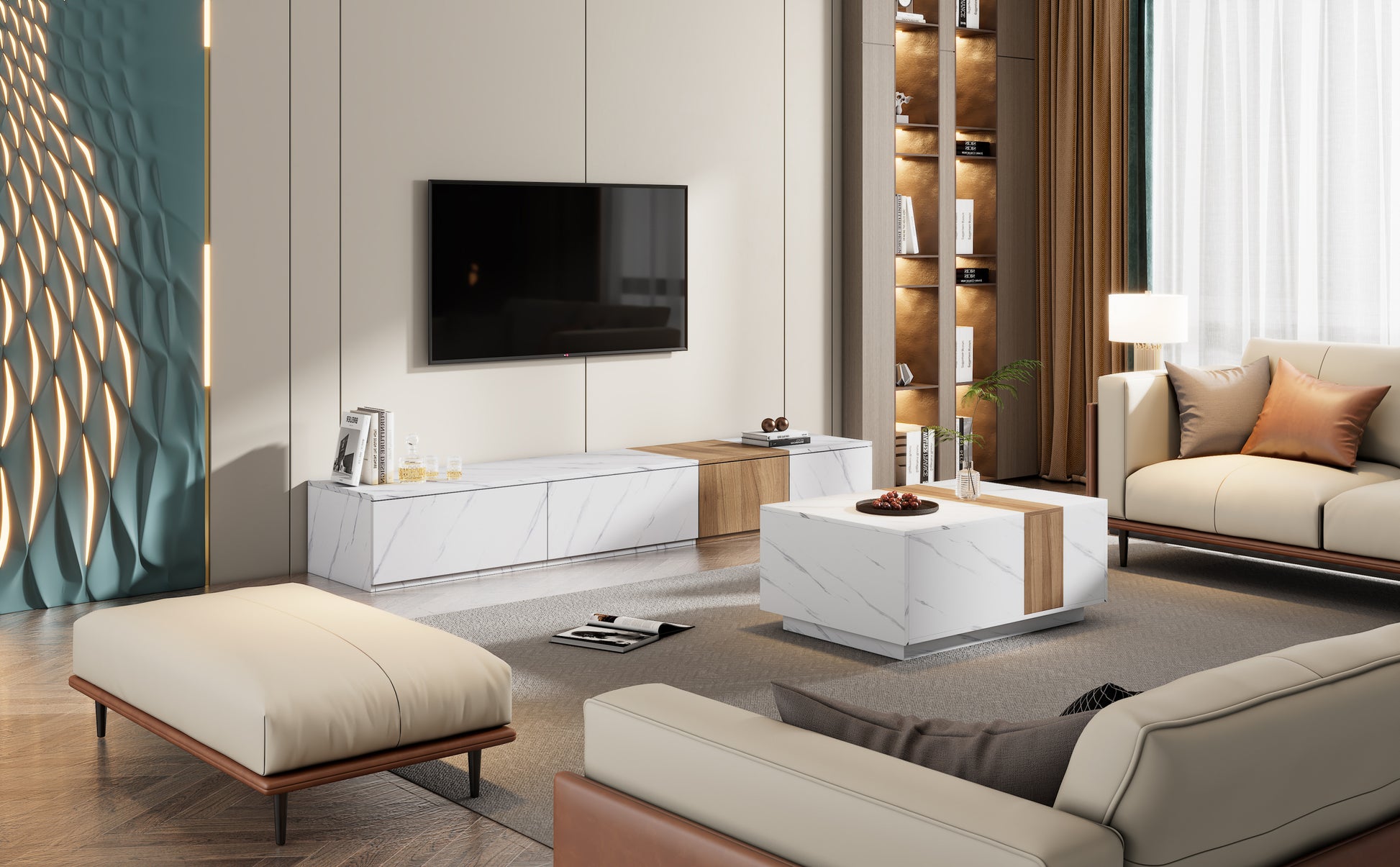 - Covered with classic faux marble and walnut grain finish, the TV stand and coffee table add a touch of modern stylish to your living room decor. The sleek faux marble tabletop and cabinet body also provide an elegant and luxurious look.