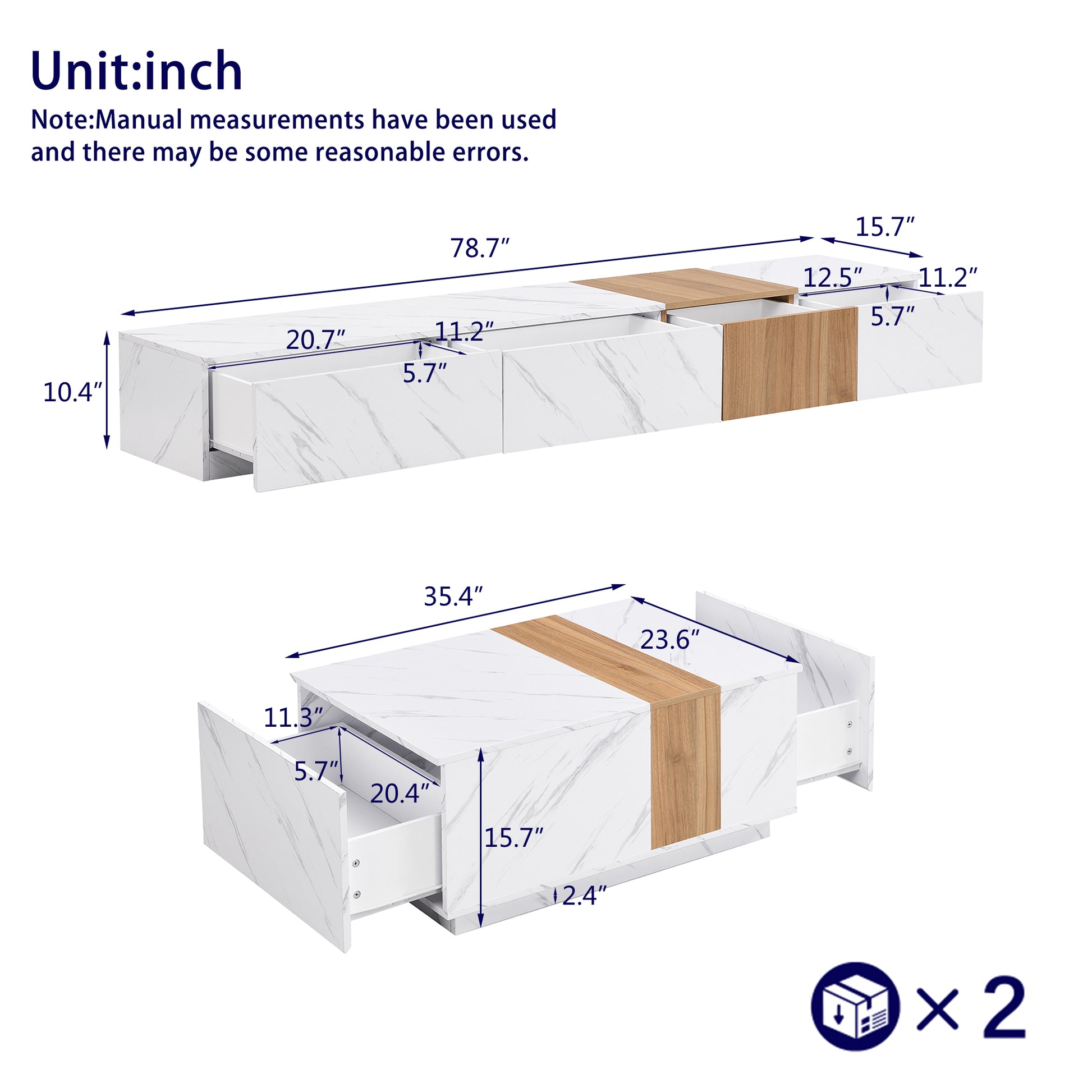 | Detailed Measurement | TV stand: 78.7’’W x 15.7’’D x 10.4’’H / Coffee Table: 35.4’’W x 23.6’’D x 15.7’’H |