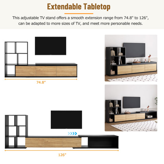 Extendable TV Stand and Coffee Table, Set of 2, Media Console with 3 Tier Bookshelves for TVs up to 110'', Dual-tone Center Table with Sliding Tabletop for Living Room, Black