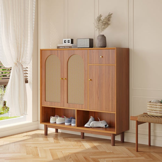 31.5" Japandi Walnut Rattan Shoe Cabinet 2-Door 4-Shelf Shoe Organizer
