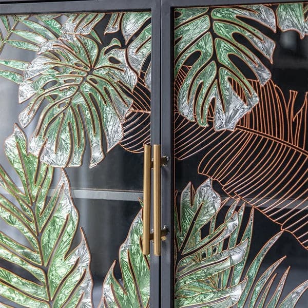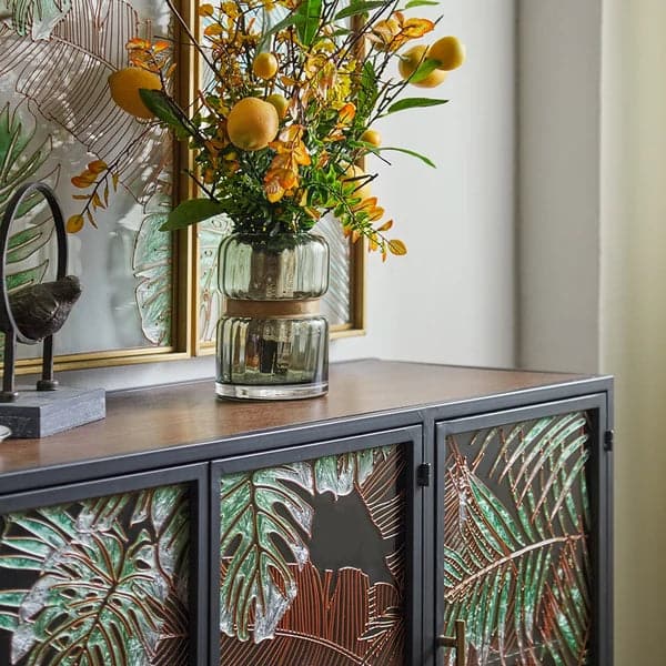 Add a touch of artful accent in your space with this colored drawing sideboard buffet. Featuring a rectangular silhouette and tempered glass doors, the sideboard lends a decent appeal to your kitchen or living room. Designed with three doors to reveal four two interior shelves, it is ideal to store your crockery and other dining essentials. And, the ample tabletop offers an ideal spot for decorative items and collected curios, practical and fashionable. Founded atop an open metal X-shaped base in a gold finish, it ensures sturdy support and stability for a timeless look and beauty.