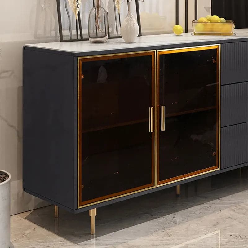 Beautifully designed with an exquisite Sintered Stone top and tempered glass doors and gold-finished stripes, this modern luxurious piece creates a refreshing sense of order in your home. Featuring 2 doors to reveal 2 shelves and 3 drawers, it enjoys ample space to store dining linens, plates, and other kitchenware collection, stunning and functional. Boasting refined wood, superb tempered glass and high-class stainless steel, this sideboard buffet allows long-lasting service and timeless sophistication.