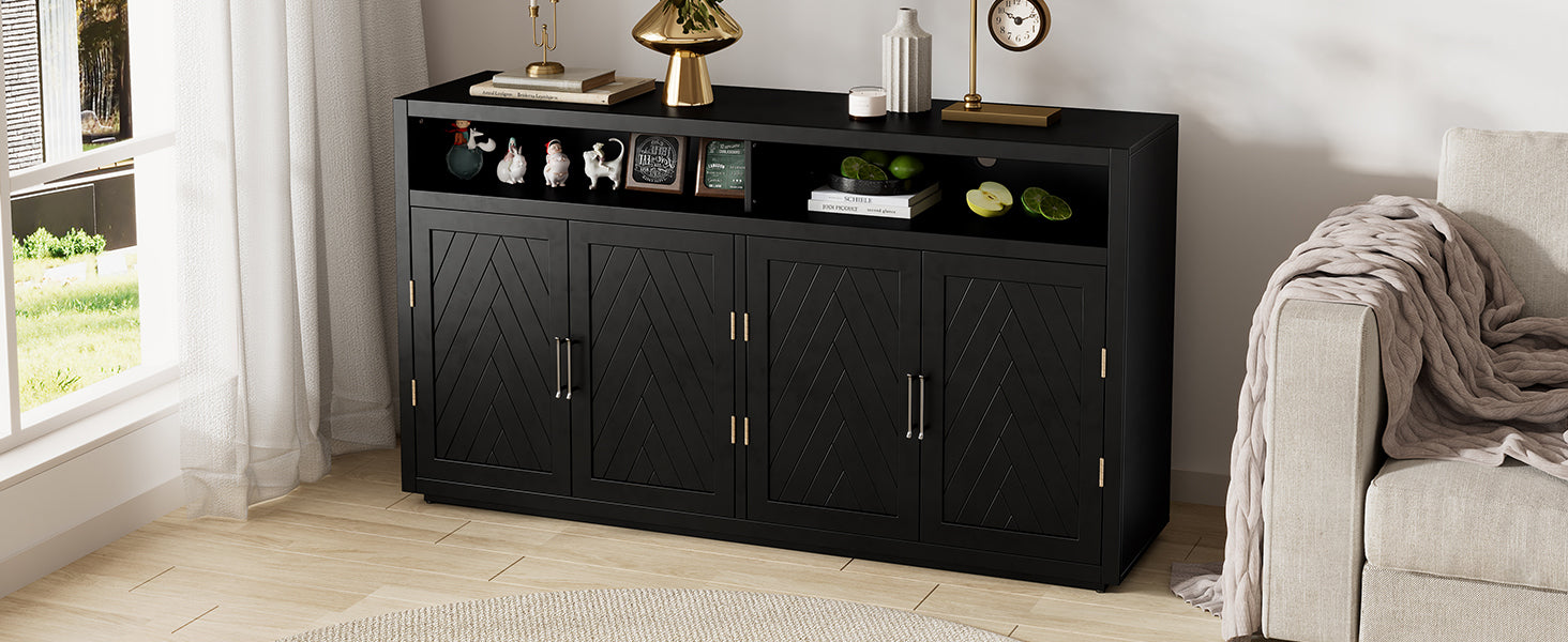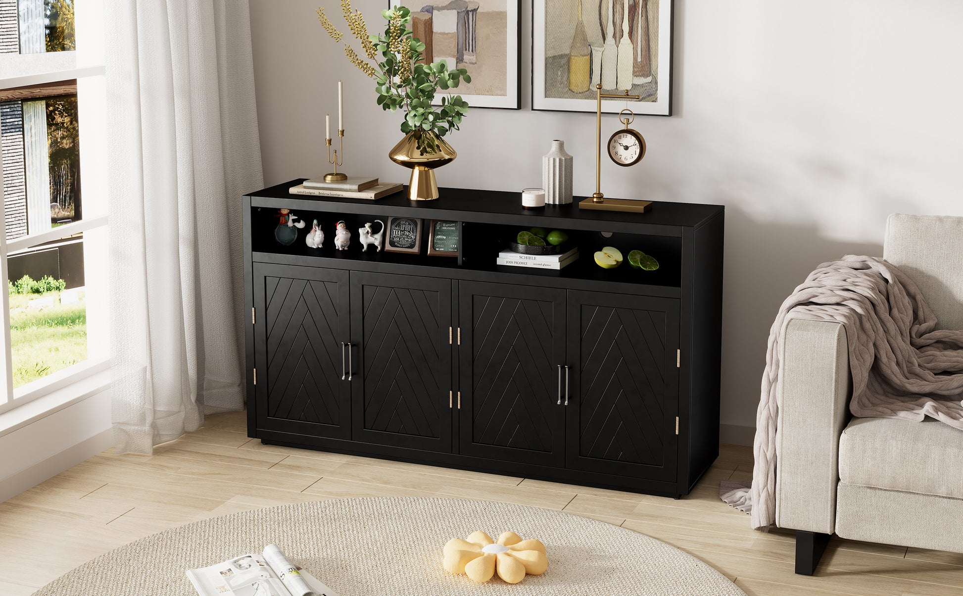 TREXM 4-door Classic Sideboard with Open Storage and Adjustable Shelves Perfect for kitchens, living rooms (Black)