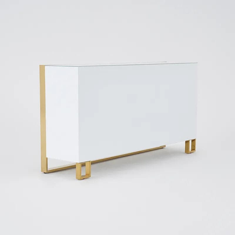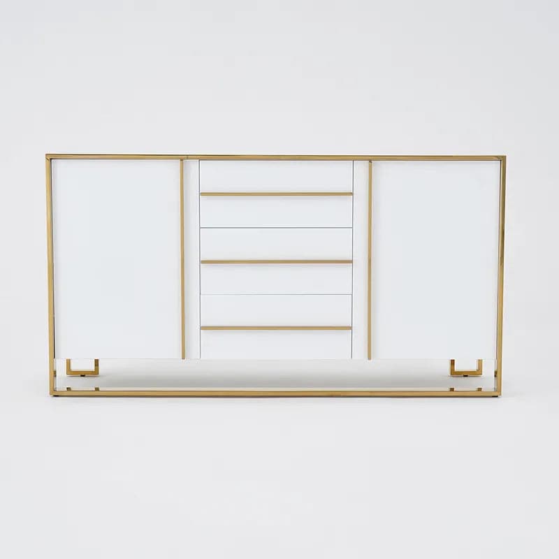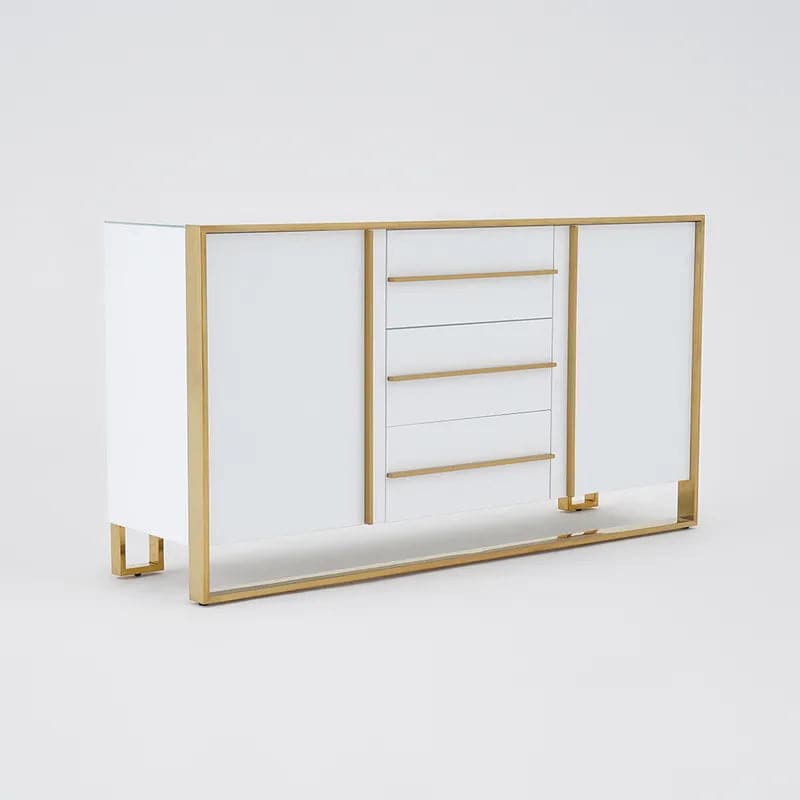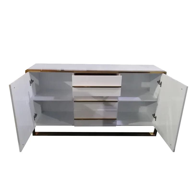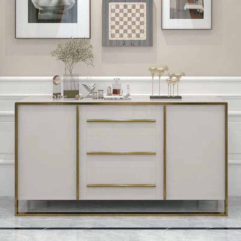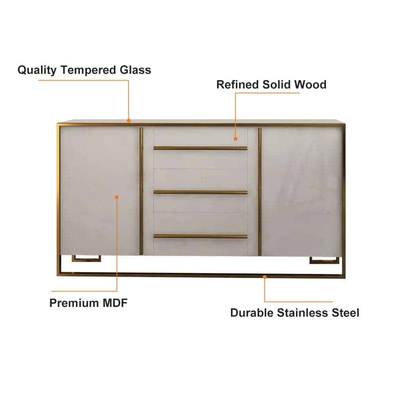 Add a touch of light luxurious style with this glossy surface buffet. Made of premium material, the buffet adds style and function to your dining or living room. Two roomy cabinets and three drawers keep everything from table linens to dinnerware out of sight but within reach. The stainless steel frame and the tempered glass top are scratch-resistant and waterproof, ensuring added durability.