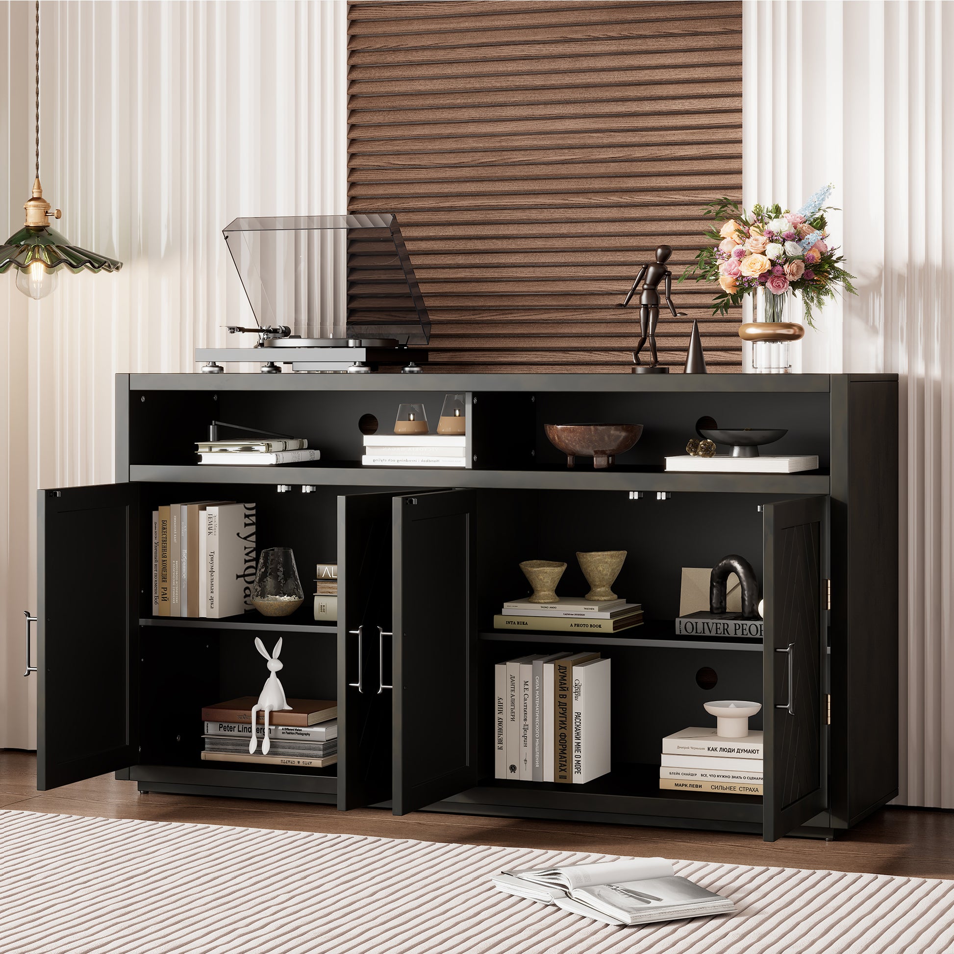 Crafted from high-quality MDF, and the base is rubber wood. This 4-door sideboard is designed to be durable and long-lasting. The sturdy construction ensures stability and reliability, while the smooth finish protects the surface from wear and tear. Tabletop load-bearing: 100 LBS; Shelf load-bearing: 65 LBS. Use it in the dining room to store dinnerware, home appliances, wine glass and linens in the living room as a media console, or in the hallway for additional storage and display space.