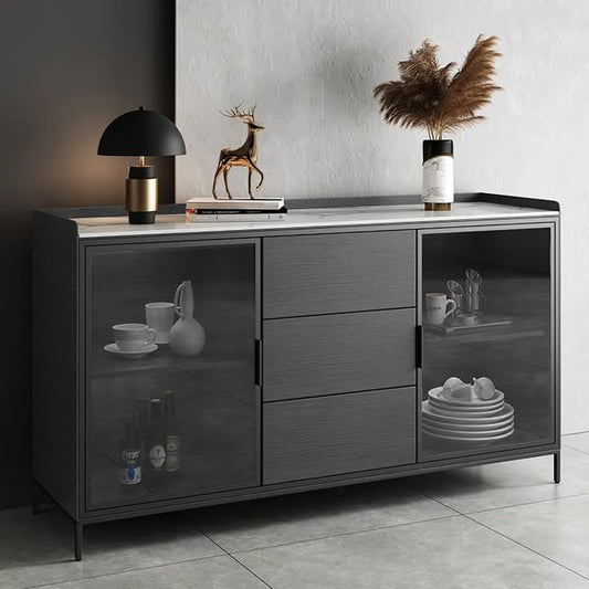 Modern Black Sideboard Buffet Sintered Stone Top Drawers&2 Doors Kitchen Cabinet