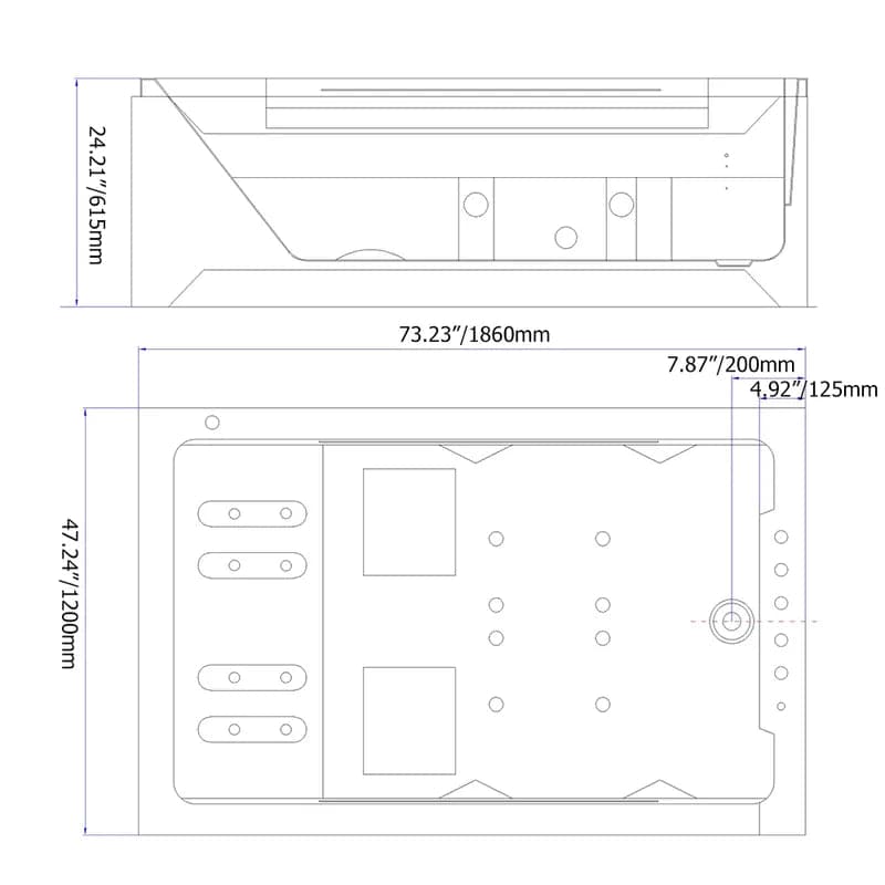 - Dimensions extérieures : 73,23"L x 47,24"L x 24,21"H (1860 mmL x 1200 mmL x 615 mmH)
