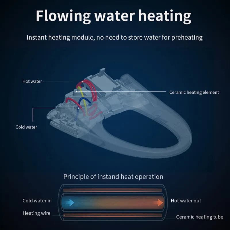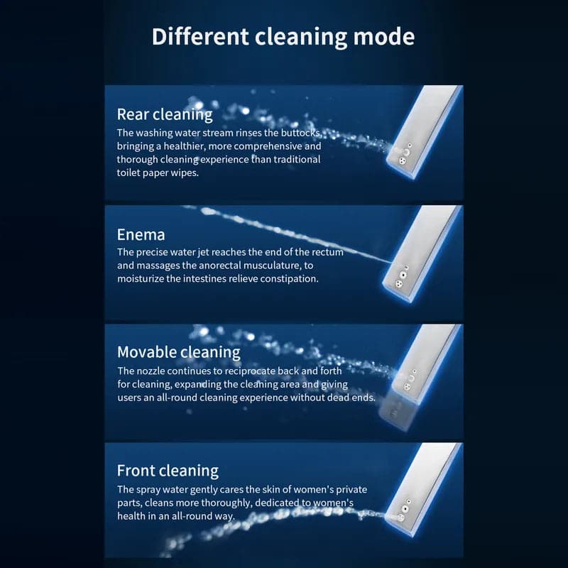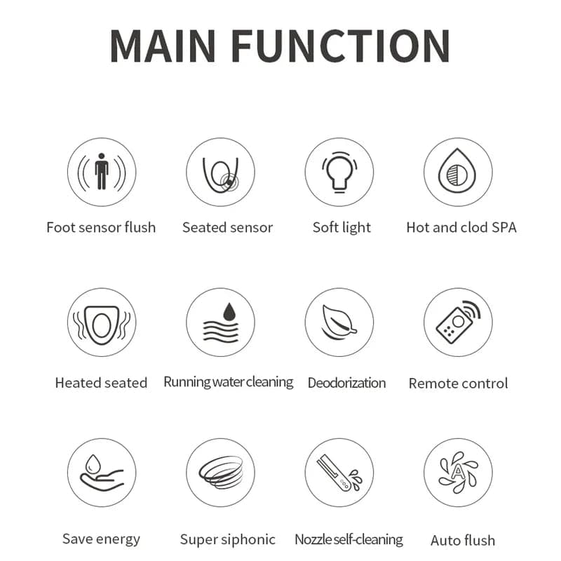 - Comprend 1. Nettoyage arrière ; 2. Nettoyer le devant ; 3. Lavement ; 4. SPA froid et chaud ; 5.Soins menstruels ; 6. Mode enfants ; 7.Une touche ; 8. Nettoyage aller-retour ; 9. Séchage au vent chaud ; 10. Siège chauffant ; 11. Veilleuse ; 12. Mode d'économie d'énergie ; 13.Désodorisation ; Contrôleur RF 14,2,4 GHz ; 15.Nettoyage des buses ; 16. protection contre les fuites électriques ; 17. Chauffage instantané ; 18. Super chasse d'eau siphonique ; 19. Chasse automatique ; 20. Chasse d'eau à télécommande ; 21. Rinçage hors tension ; 22. Siège de ralentissement d'amortissement ; 23.Augmentation de la pompe à air ; 24. Buse autonettoyante ; 25.Capteur assis ; 26. Eau, siège, vent, réglage de la température de l'eau ; 27.Réglage de la pression de l’eau ; 28. Rinçage du capteur