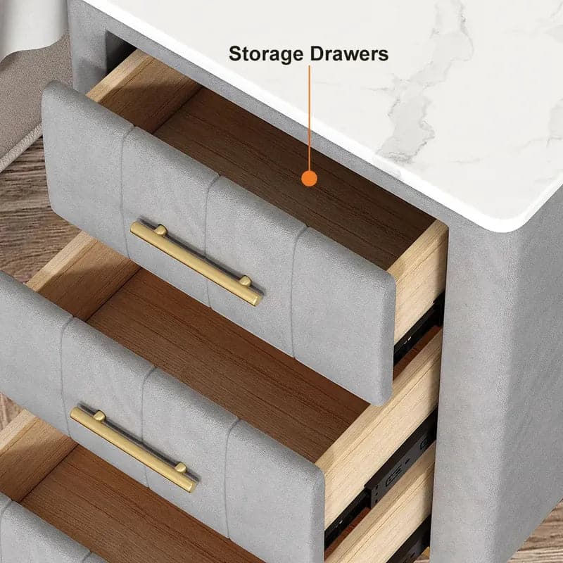 Table de chevet moderne en velours gris, 3 tiroirs, plateau en pierre frittée