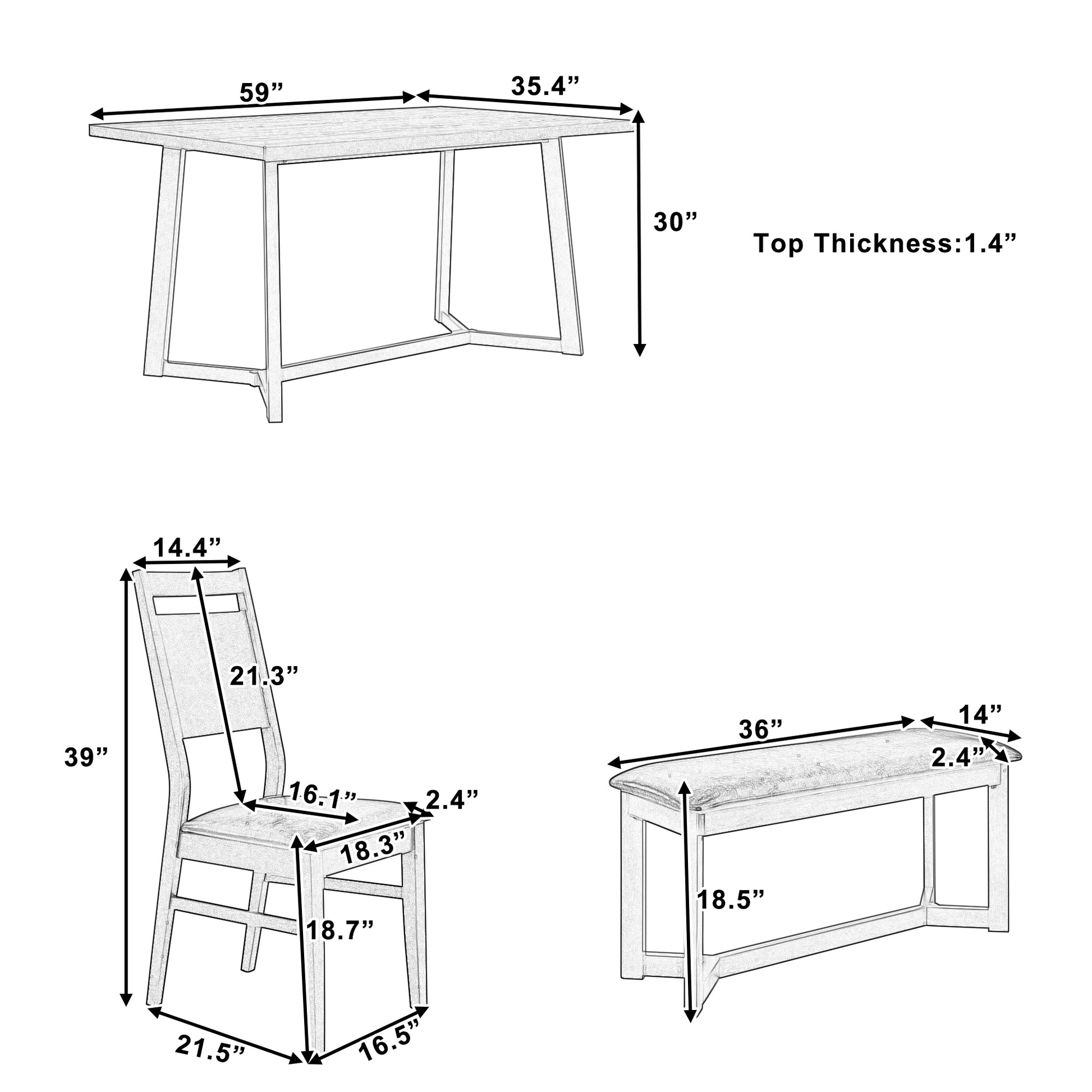 Dimension globale du produit Table à manger : 59 x 35,4 x 30 pouces (LXPXH) ; Épaisseur supérieure : 1,4 pouces ; Chaise de salle à manger : 16,5 x 21,5 x 39 pouces (LXWXH) ; Profondeur du siège : 16,1 pouces ; Du siège au sol : 18,7 pouces ; Banc de salle à manger : 36x14x18,5 pouces (LXLXH)