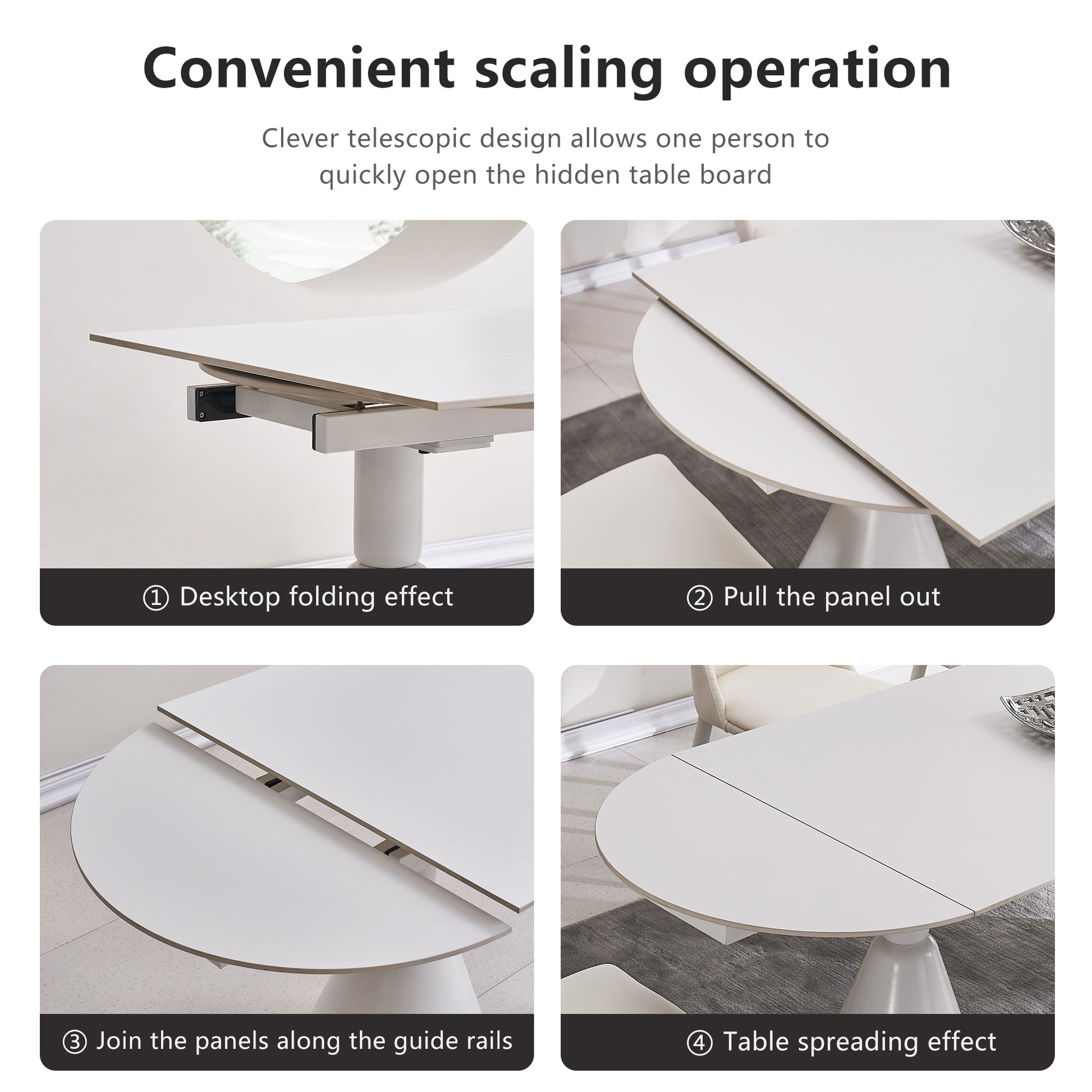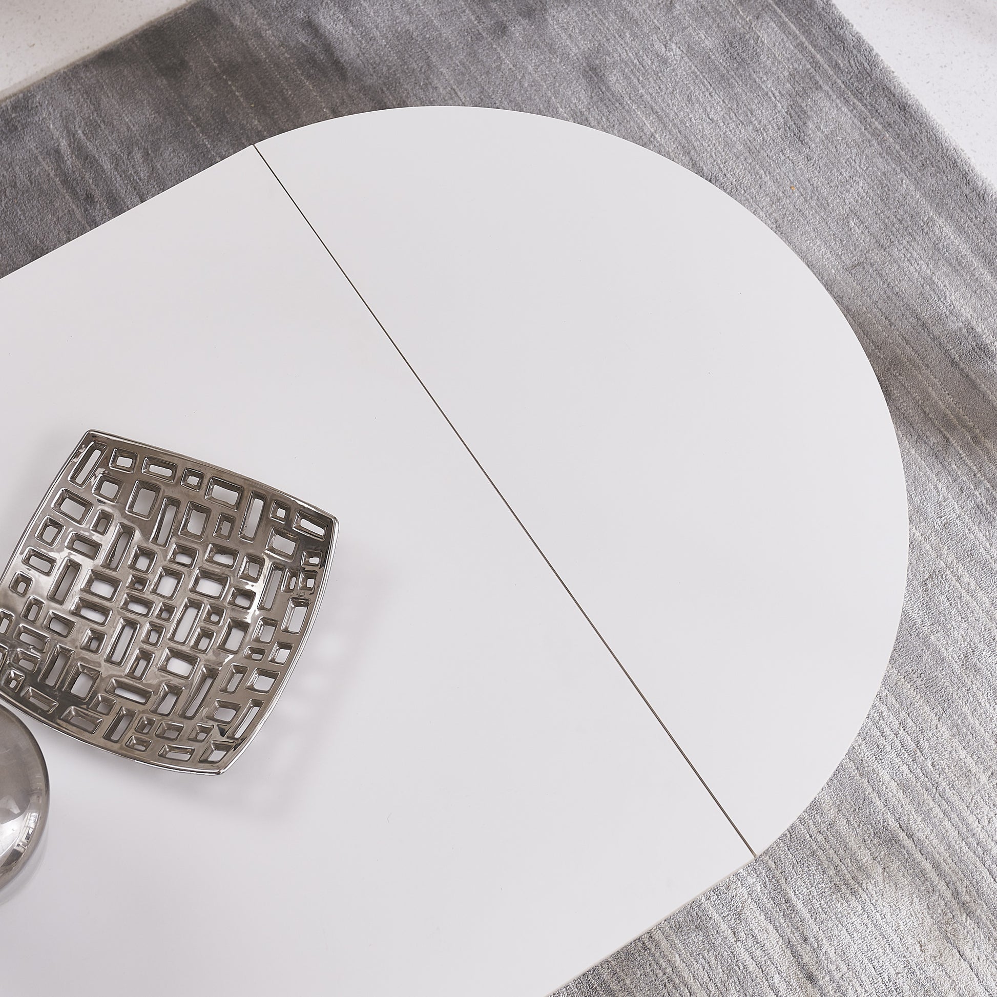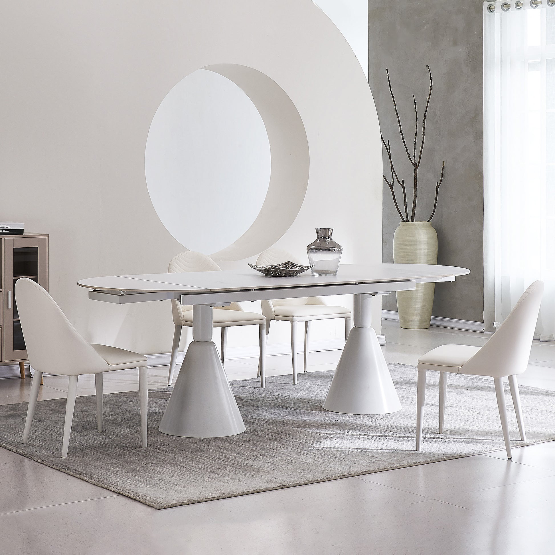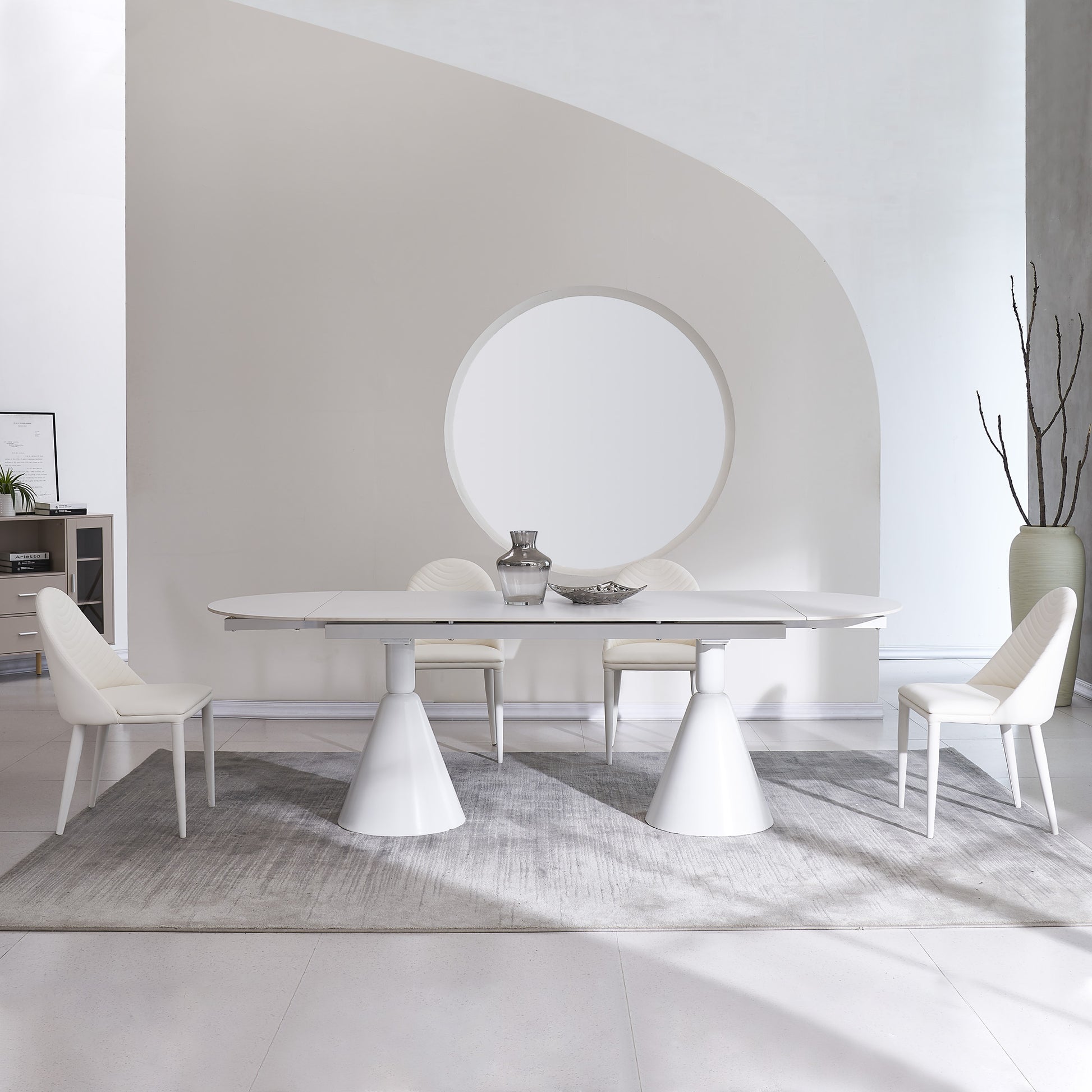 Table de salle à manger blanche extensible ovale moderne de 94,9 po pour 8 personnes avec plateau en pierre frittée et base en acier inoxydable